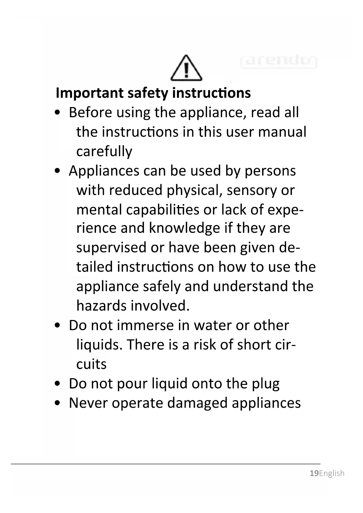 - Please keep these instrucons in a safe place!27English Thank you for purchasing a product from Arendo. Please read the following operang instrucons carefully so that you can enjoy your purchased appliance for a long me.