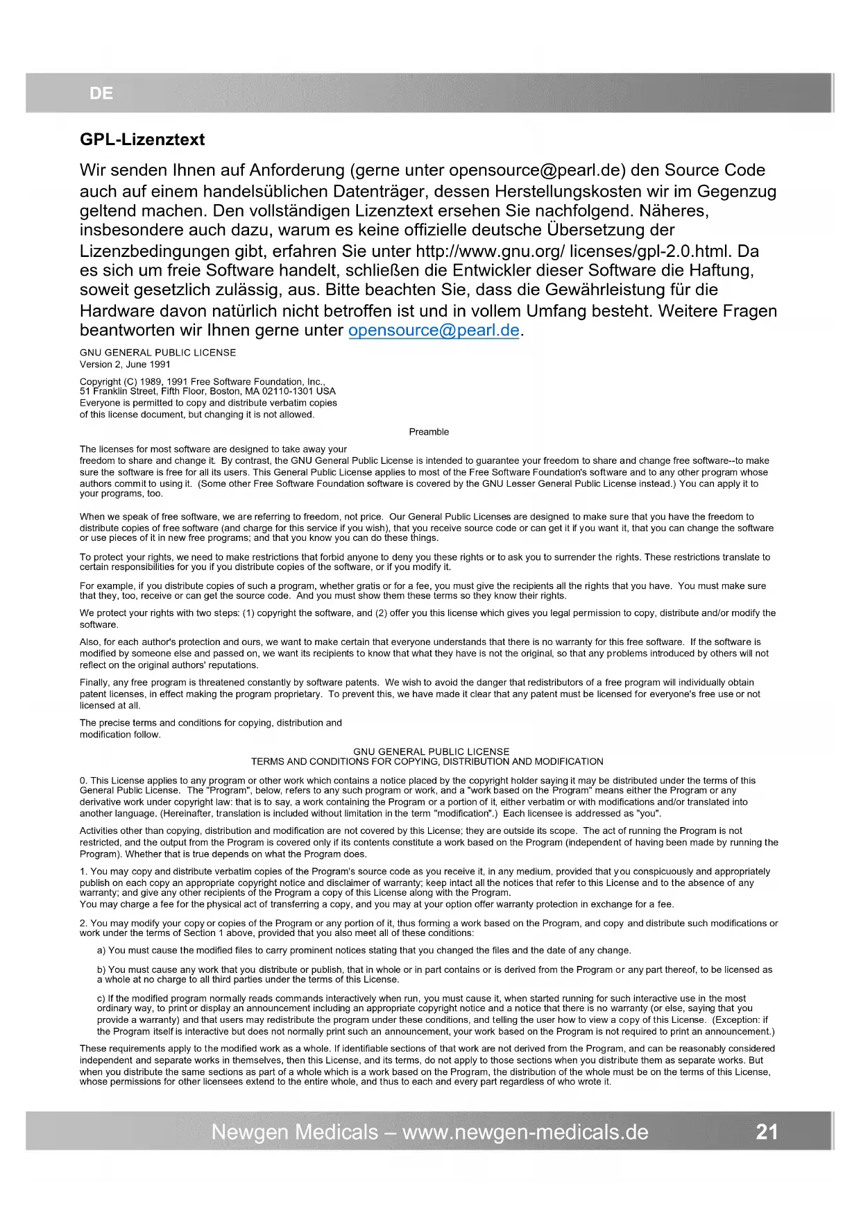 How to Apply These Terms to Your New Programs If you develop a new program, and you want it to be of the greatest possible use to the public, the best way to achieve this is to make it free software which everyone can redistribute and change under these terms. To do so, attach the following notices to the program. It is safest to attach them to the start of each source file to most effectively convey the exclusion of warranty; and each file should have at least the "copyright" line and a pointer to where the full notice is found. <one line to give the program's name and a brief idea of what it does.> Copyright (C) <year> <name of author>DE Newgen Medicals – www.newgen-medicals.de 23 This program is free software; you can redistribute it and/or modify it under the terms of the GNU General Public License as published by the Free Software Foundation; either version 2 of the License, or (at your option) any later version. This program is distributed in the hope that it will be useful, but WITHOUT ANY WARRANTY; without even the implied warranty of MERCHANTABILITY or FITNESS FOR A PARTICULAR PURPOSE. See the GNU General Public License for more details. You should have received a copy of the GNU General Public License along with this program; if not, write to the Free Software Foundation, Inc., 51 Franklin Street, Fifth Floor, Boston, MA 02110-1301 USA. Also add information on how to contact you by electronic and paper mail. If the program is interactive, make it output a short notice like this when it starts in an interactive mode: Gnomovision version 69, Copyright (C) year name of author Gnomovision comes with ABSOLUTELY NO WARRANTY; for details type `show w'. This is free software, and you are welcome to redistribute it under certain conditions; type `show c' for details. The hypothetical commands `show w' and `show c' should show the appropriate parts of the General Public License. Of course, the commands you use may be called something other than `show w' and `show c'; they could even be mouse-clicks or menu items--whatever suits your program. You should also get your employer (if you work as a programmer) or your school, if any, to sign a "copyright disclaimer" for the program, if necessary. Here is a sample; alter the names: Yoyodyne, Inc., hereby disclaims all copyright interest in the program `Gnomovision' (which makes passes at compilers) written by James Hacker. <signature of Ty Coon>, 1 April 1989 Ty Coon, President of Vice This General Public License does not permit incorporating your program into proprietary programs. If your program is a subroutine library, you may consider it more useful to permit linking proprietary applications with the library. If this is what you want to do, use the GNU Lesser General Public License instead of this License.DE Kundenservice: DE: +49(0)7631–360–350 CH: +41(0)848–223–300 FR: +33(0)388–580–202 Importiert von: PEARL.GmbH | PEARL-Straße 1–3 | D-79426 Buggingen
