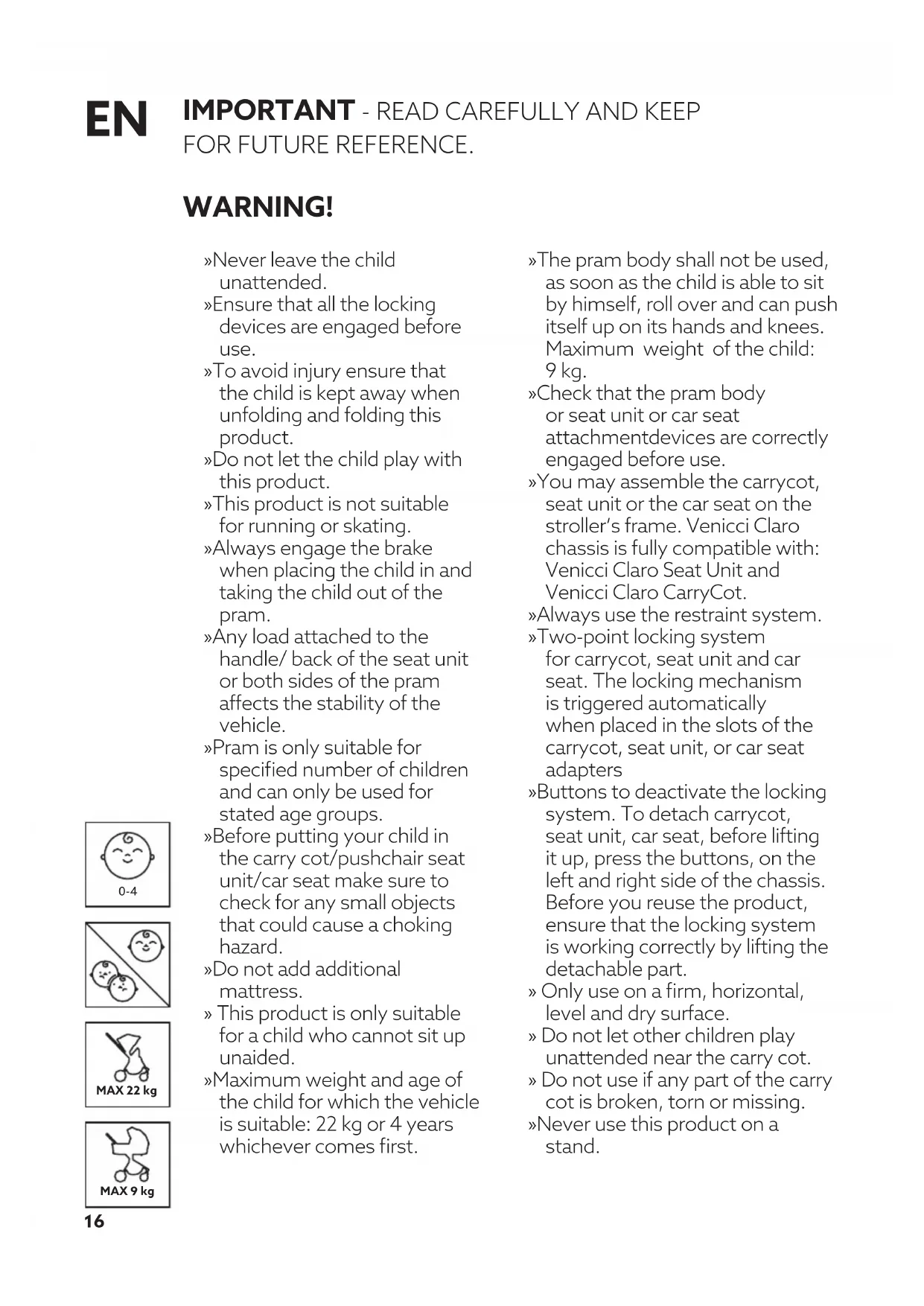 FOR FUTURE REFERENCE. WARNING! » Never leave the child unattended. » Ensure that all the locking devices are engaged before use. » To avoid injury ensure that the child is kept away when unfolding and folding this product. » Do not let the child play with this product. » This product is not suitable for running or skating. » Always engage the brake when placing the child in and taking the child out of the pram. » Any load attached to the handle/ back of the seat unit or both sides of the pram affects the stability of the vehicle. » Pram is only suitable for specified number of children and can only be used for stated age groups. » Before putting your child in the carry cot/pushchair seat unit/car seat make sure to check for any small objects that could cause a choking hazard. » Do not add additional mattress. » This product is only suitable for a child who cannot sit up unaided. » Maximum weight and age of the child for which the vehicle is suitable: 22 kg or 4 years whichever comes first. » The pram body shall not be used, as soon as the child is able to sit by himself, roll over and can push itself up on its hands and knees. Maximum weight of the child: 9 kg. » Check that the pram body or seat unit or car seat attachmentdevices are correctly engaged before use. » You may assemble the carrycot, seat unit or the car seat on the stroller’s frame. Venicci Claro chassis is fully compatible with: Venicci Claro Seat Unit and Venicci Claro CarryCot. » Always use the restraint system. » Two-point locking system for carrycot, seat unit and car seat. The locking mechanism is triggered automatically when placed in the slots of the carrycot, seat unit, or car seat adapters » Buttons to deactivate the locking system. To detach carrycot, seat unit, car seat, before lifting it up, press the buttons, on the left and right side of the chassis. Before you reuse the product, ensure that the locking system is working correctly by lifting the detachable part. » Only use on a firm, horizontal, level and dry surface. » Do not let other children play unattended near the carry cot. » Do not use if any part of the carry cot is broken, torn or missing. » Never use this product on a stand.17