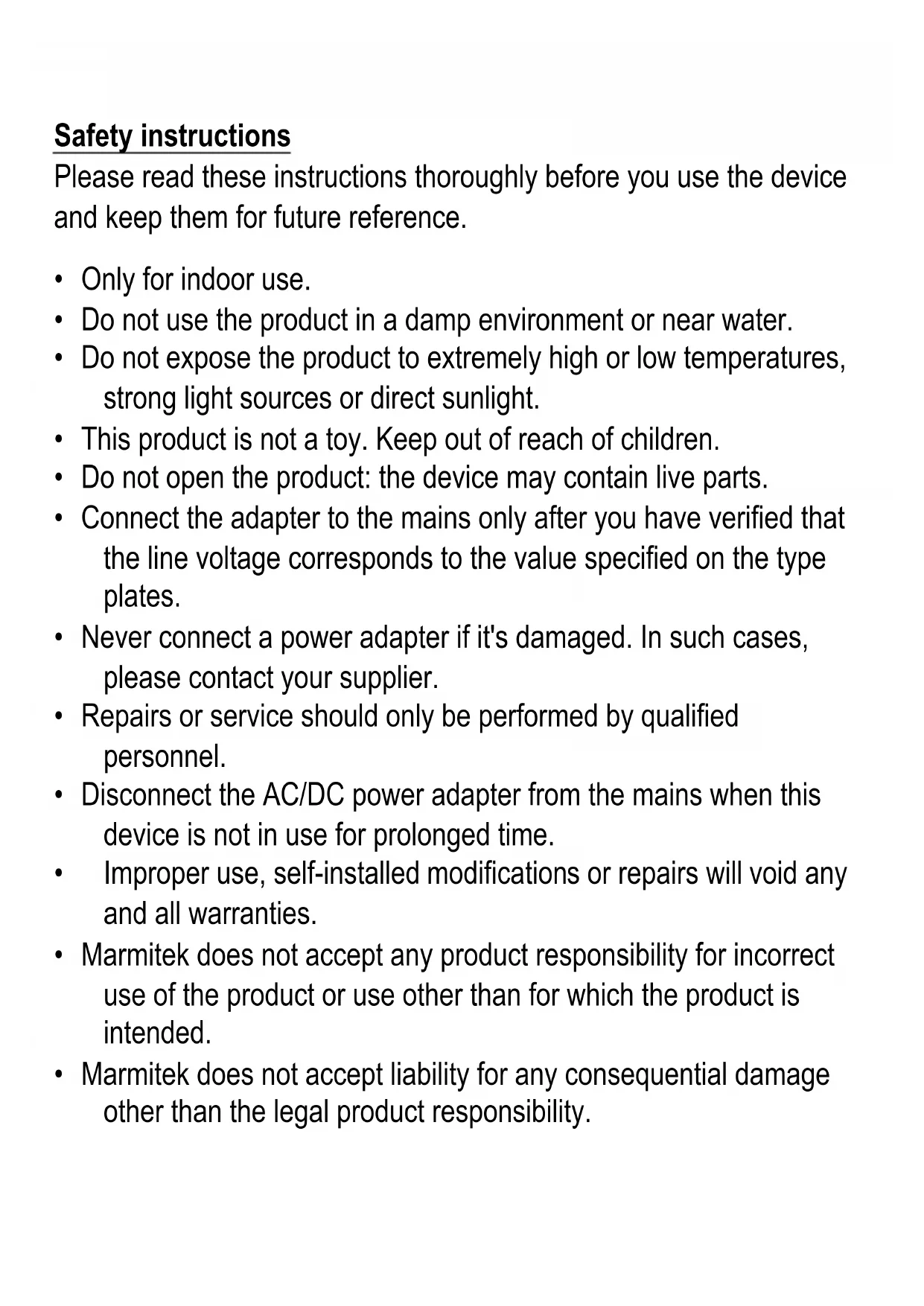 - Marmitek does not accept any product responsibility for incorrect use of the product or use other than for which the product is intended.