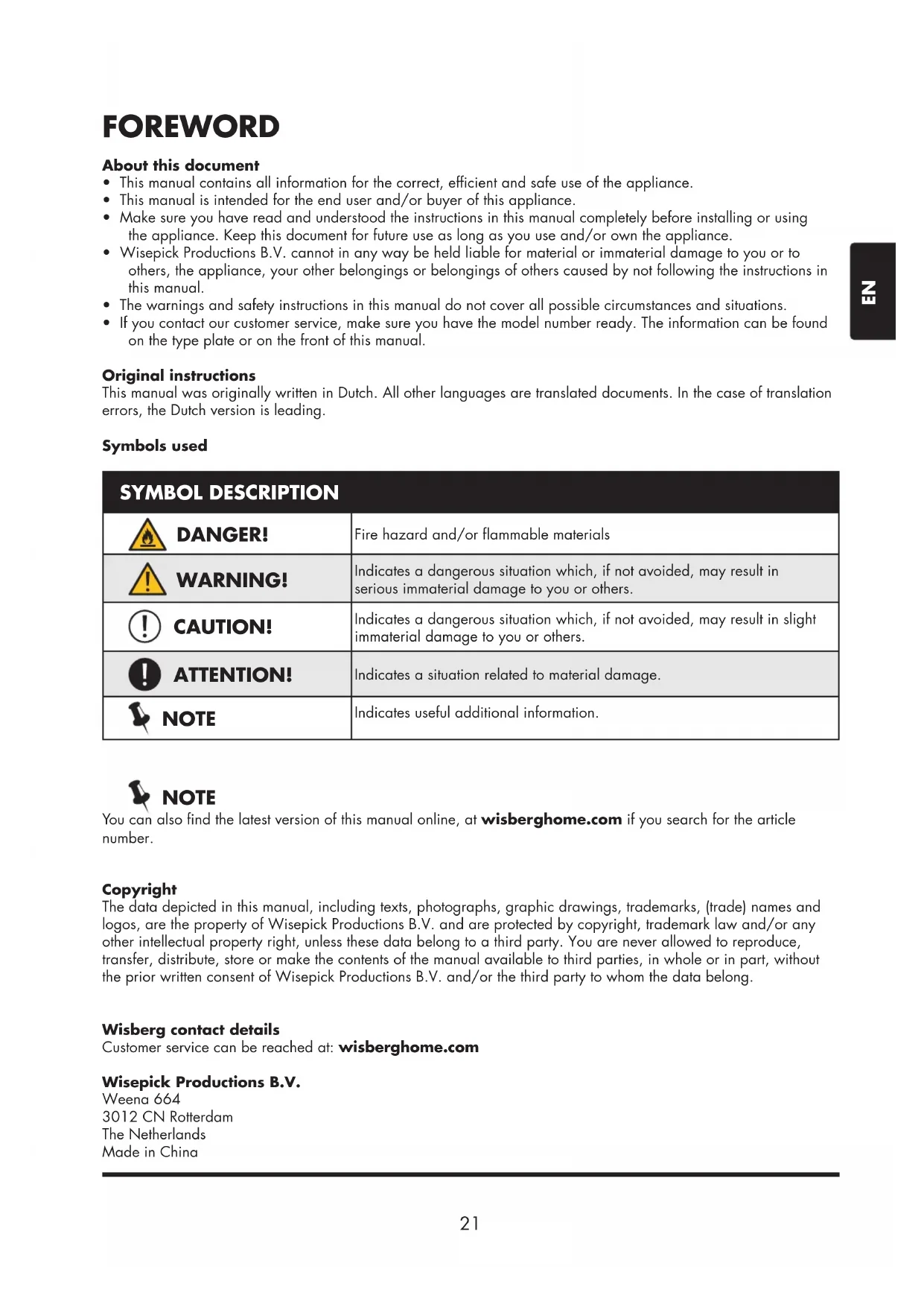- If you contact our customer service, make sure you have the model number ready. The information can be found on the type plate or on the front of this manual. Original instructions This manual was originally written in Dutch. All other languages are translated documents. In the case of translation errors, the Dutch version is leading. Symbols used SYMBOL DESCRIPTION Fire hazard and/or ammable materials Indicates a dangerous situation which, if not avoided, may result in serious immaterial damage to you or others. Indicates a dangerous situation which, if not avoided, may result in slight immaterial damage to you or others. Indicates a situation related to material damage. Indicates useful additional information. You can also nd the latest version of this manual online, at wisberghome.com if you search for the article number. DANGER! CAUTION! ATTENTION! WARNING! NOTE NOTE Copyright The data depicted in this manual, including texts, photographs, graphic drawings, trademarks, (trade) names and logos, are the property of Wisepick Productions B.V. and are protected by copyright, trademark law and/or any other intellectual property right, unless these data belong to a third party. You are never allowed to reproduce, transfer, distribute, store or make the contents of the manual available to third parties, in whole or in part, without the prior written consent of Wisepick Productions B.V. and/or the third party to whom the data belong. Wisberg contact details Customer service can be reached at: wisberghome.com Wisepick Productions B.V. Weena 664 3012 CN Rotterdam The Netherlands Made in China22