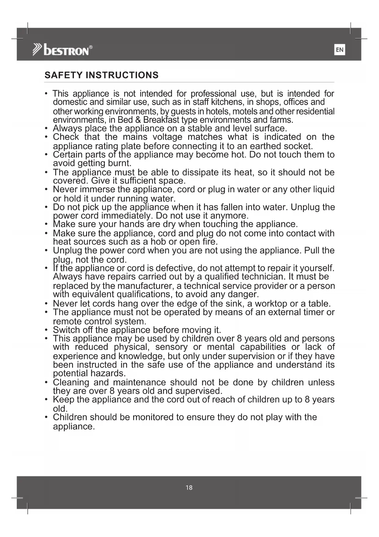 - Your municipality can tell you where to nd the designated waste collection point in your neighbourhood. SERVICE In the unlikely event of a malfunction, please contact Bestron customer service: www.bestron.com/service Technical Specifications Model AMN100CO Mains 230V~ Frequency (Hz) 50 Safety Class 1 Power (Watt) Input power 1150W Output power 700W Noise (dB(A)) - Max. Capacity ca. 20L Maximum continuous operating time (KB) - Dimensions (H x B x D) (cm) 45 x 35 x 26 Cable length (cm) 8521