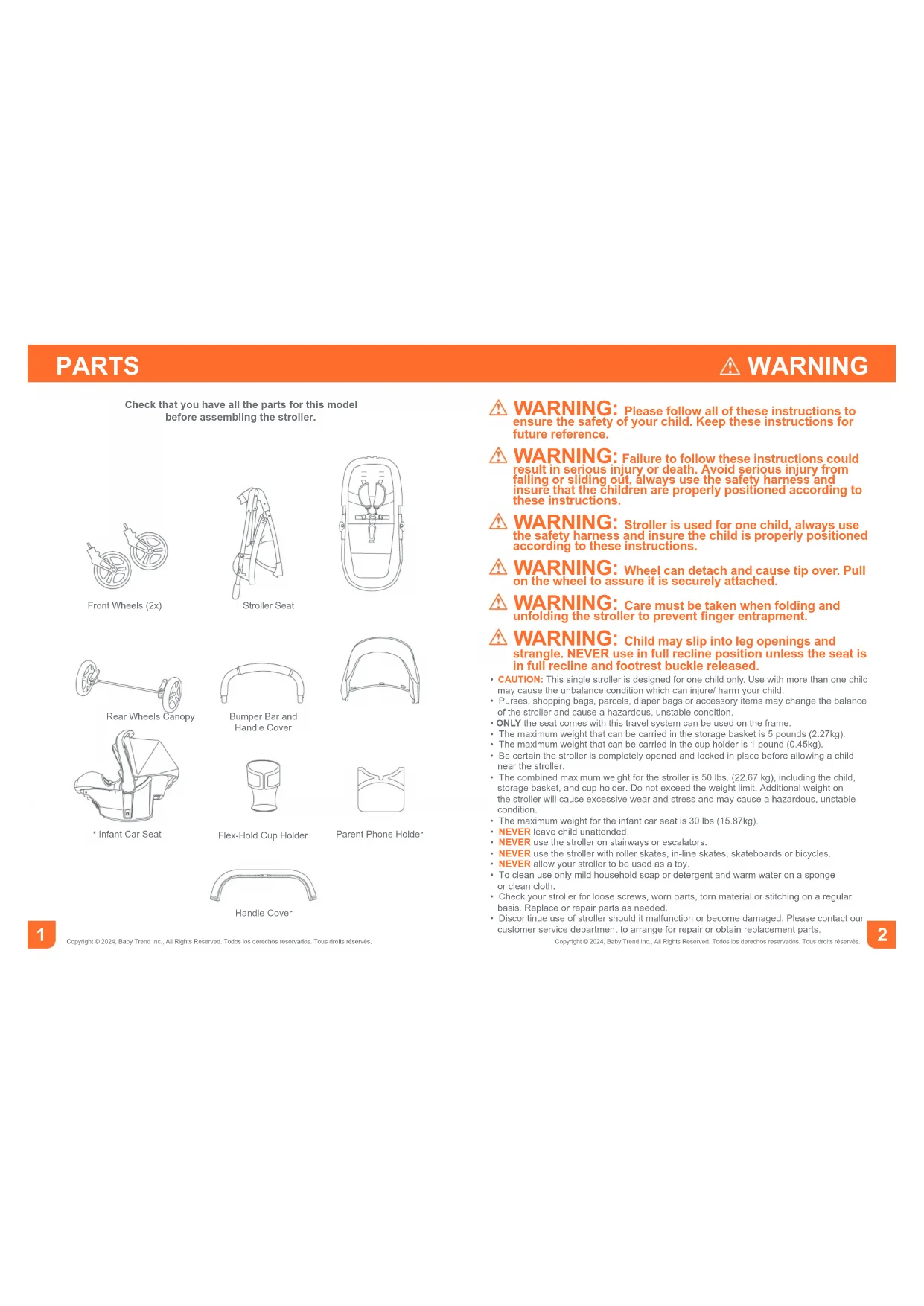 Copyright © 2024, Baby Trend Inc., All Rights Reserved. Todos los derechos reservados. Tous droits réservés. Check that you have all the parts for this model before assembling the stroller. Stroller SeatFront Wheels (2x)Bumper Bar and Handle Cover Handle CoverRear Wheels Canopy Parent Phone HolderFlex-Hold Cup Holder * Infant Car Seat