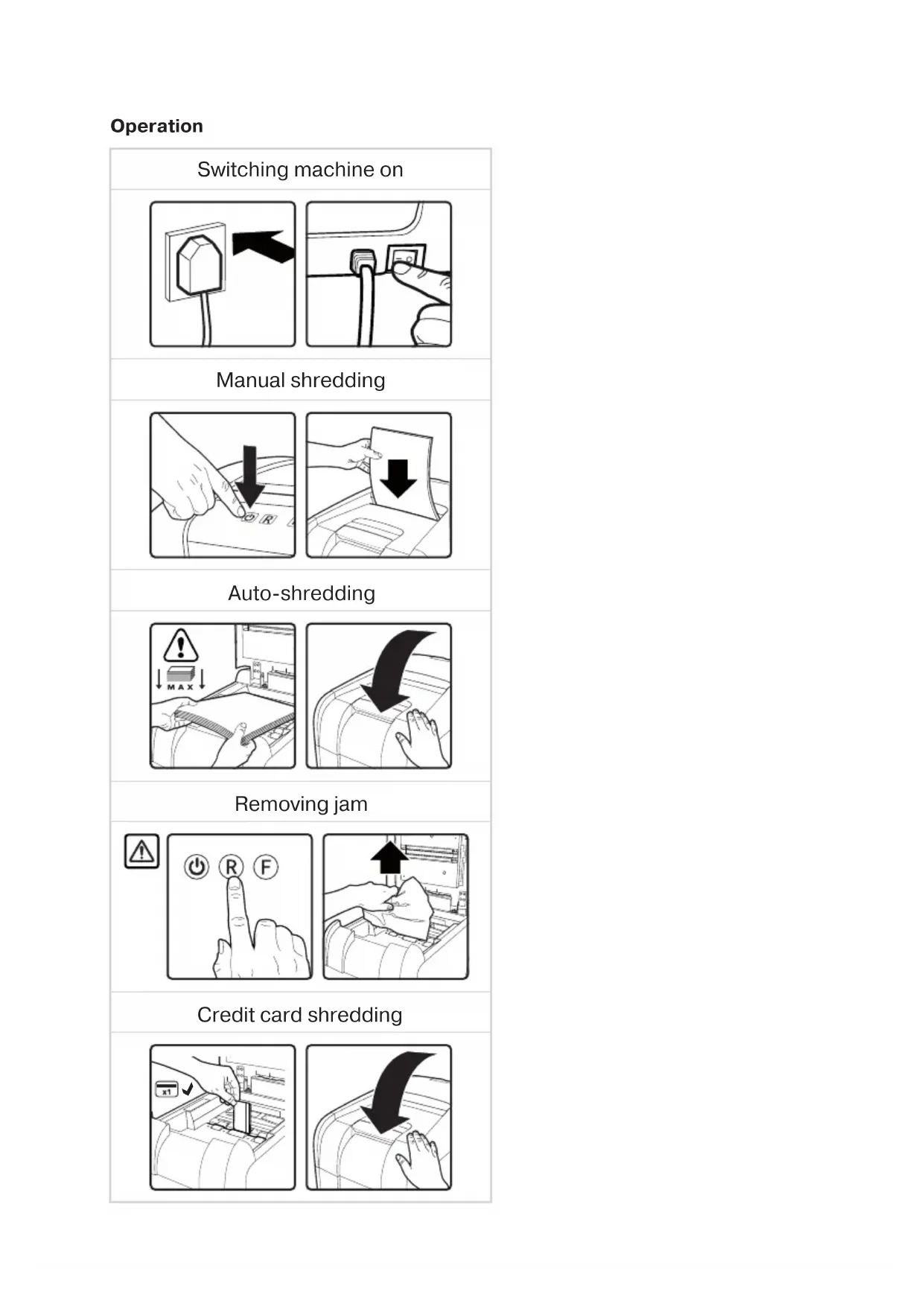 Icon Type Models Button / indication & action Auto-start and stand-by button (press one time) Manual reverse button (hold down) Manual forward run button (hold down) Ready indication Over heating indication (Allow to cool) Overloaded / Jam indication (Reduce sheet / remove jam) Bin full indication (open door (45X lift o head) and empty the bin) Door open or shredder head removed indication (close door firmly or replace head on bin) Hopper locked indication (unlock by entering 4 digit combination) Hopper locking security combination button 1 Hopper locking security combination button 2 Hopper locking security combination button 3 Hopper locking security combination button 4 Operation