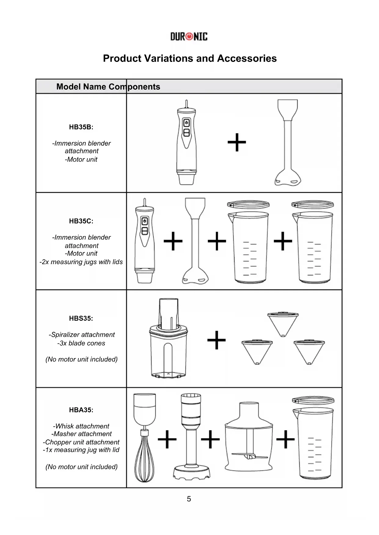 - Store the appliance in a cool, dry place away from direct sunlight or other heat sources. Please follow the safety instructions, specications, and guidelines in this manual for proper usage and care of your hand blender. If you have any questions or concerns, please contact the manufacturer for assistance. Enjoy using your hand blender! CAUTION: Please be very careful when handling the cones as they are very sharp. Do not try and twist them into place whilst holding the bottom of the cone. Only touch the plastic side and drop it into the space for it in the lid.15 Troubleshooting Problem Probable Cause Solution The blender handle does not turn on. The appliance is not plugged into the mains. Put the mains plug in an earthed wall socket. The appliance is overheated. Leave the appliance to cool down for at least 15 minutes. Make sure not to have the appliance running for more than 3 minutes at a time. Food is not fully blended. The amount of the ingredients is too much. Either keep blending or reduce the amount of ingredients. The amount of the ingredients is too little. Increase the amount of ingredients or liquid so the blade can be submerged enough to blend. The ingredients are too hard. Make sure the ingredients are suitable for the attachment. When using hard vegetables, cook through to soften or chop into smaller chunks. The ingredients are blended / mashed unevenly. Not blended / mashed for long enough. Keep blending / mashing until the desired consistency is reached. Be careful to not overheat the appliance. The attachment won’t connect to the blender handle. The correct coupling has not been attached between the blender handle and the attachment. Attach the correct coupling to the handle and the attachment. The parts should click into place.16 Troubleshooting If you have any further issues, please contact Duronic. Problem Probable Cause Solution The container / jug is melting or warped. The ingredients are too hot. Make sure that any ingredients do not exceed the maximum temperature of 70°C. Food will not spiralize Ingredient is too soft. Check vegetables are rm and fresh. Hollow and soft ingredients will not work in the spiralizer. Ingredient is too hard. Use a softer or riper ingredient. Ingredient is too small. Use a larger ingredient. The spiralizer cone is clogged. Switch off the machine and carefully remove and clean the cone. The ingredient is not fully seated onto the pusher. Push a at end of the ingredient rmly onto the prongs of the spiralizer coupling. You may need to chop the end of the ingredient to make a suitable surface.17 Manuel d’utilisation en français18 Caractéristiques et Spécications Composants