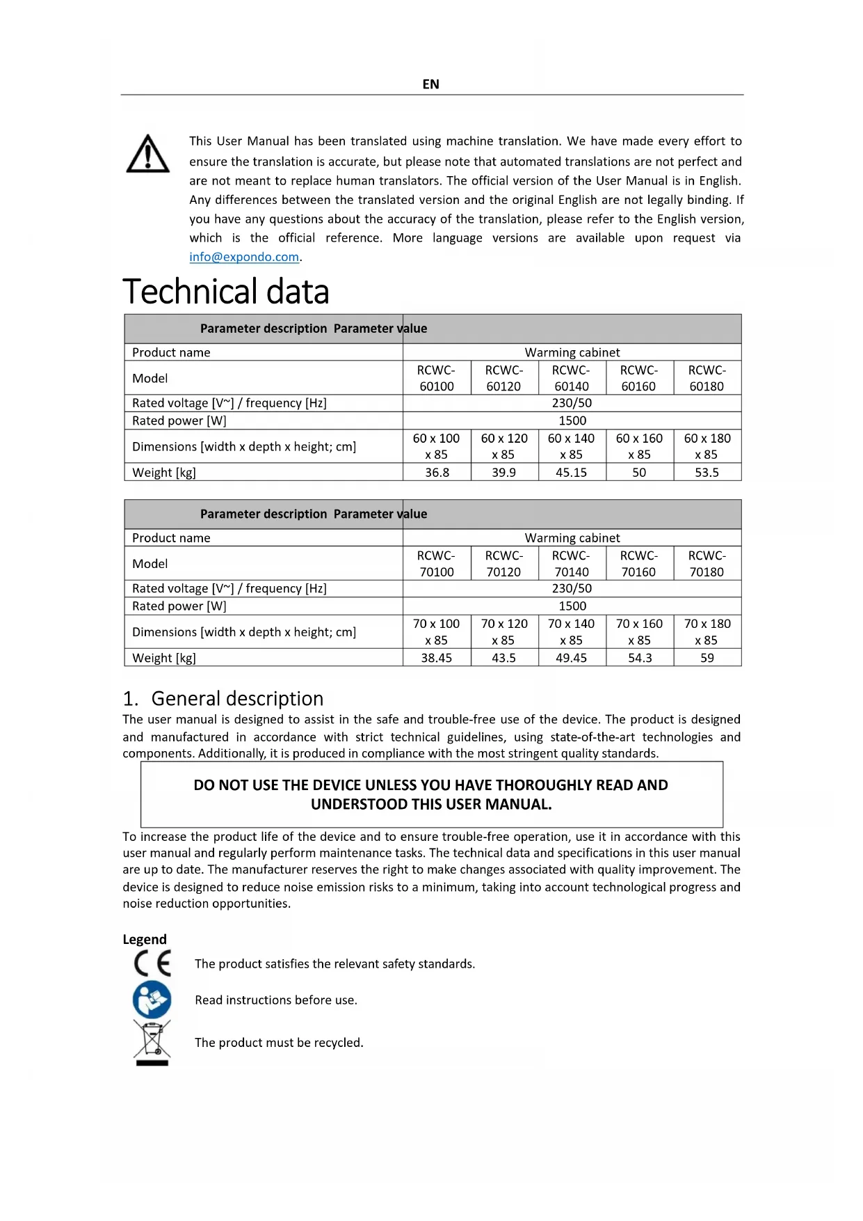 ATTENTION! Read all safety warnings and all instructions. Failure to follow the warnings and instructions may result in electric shock, fire and/or serious injury or even death. The terms "device" or "product" are used in the warnings and instructions to refer to: Warming cabinet 2.1. Electrical safety a) The plug must fit the socket. Do not modify the plug in any way. Using original plugs and matching sockets reduces the risk of electric shock. b) Use the cable only for its designated use. Never use it to carry the device or to pull the plug out of a socket. Keep the cable away from heat sources, oil, sharp edges or moving parts. Damaged or tangled cables increase the risk of electric shock. c) If using the device in a damp environment cannot be avoided, a residual current device (RCD) should be applied. The use of an RCD reduces the risk of electric shock. d) Do not use the device if the power cord is damaged or shows obvious signs of wear. A damaged power cord should be replaced by a qualified electrician or the manufacturer‘s service centre. e) To avoid electric shock, do not immerse the cord, plug or device in water or other liquids. Do not use the device on wet surfaces. f) Do not use in very humid environments or in the direct vicinity of water tanks. g) Prevent the device from getting wet. Risk of electric shock! h) Before the first use, please check whether the main voltage type and current comply with the indicated data on the type plate. 2.2. Safety in the workplace a) Make sure the workplace is clean and well lit. A messy or poorly lit workplace may lead to accidents. Try to think ahead, observe what is going on and use common sense when working with the device. b) Do not use the device in a potentially explosive environment, for example in the presence of flammable liquids, gases or dust. The device generates sparks which may ignite dust or fumes. c) If you discover damage or irregular operation, immediately switch the device off and report it to a supervisor without delay. d) If there are any doubts as to the correct operation of the device, contact the manufacturer's support service. e) Only the manufacturer's service point may repair the device. Do not attempt any repairs independently! f) In case of fire, use a powder or carbon dioxide (CO2) fire extinguisher (one intended for use on live electrical devices) to put it out. g) Use the device in a well-ventilated space. h) Regularly inspect the condition of the safety labels. If the labels are illegible, they must be replaced.
