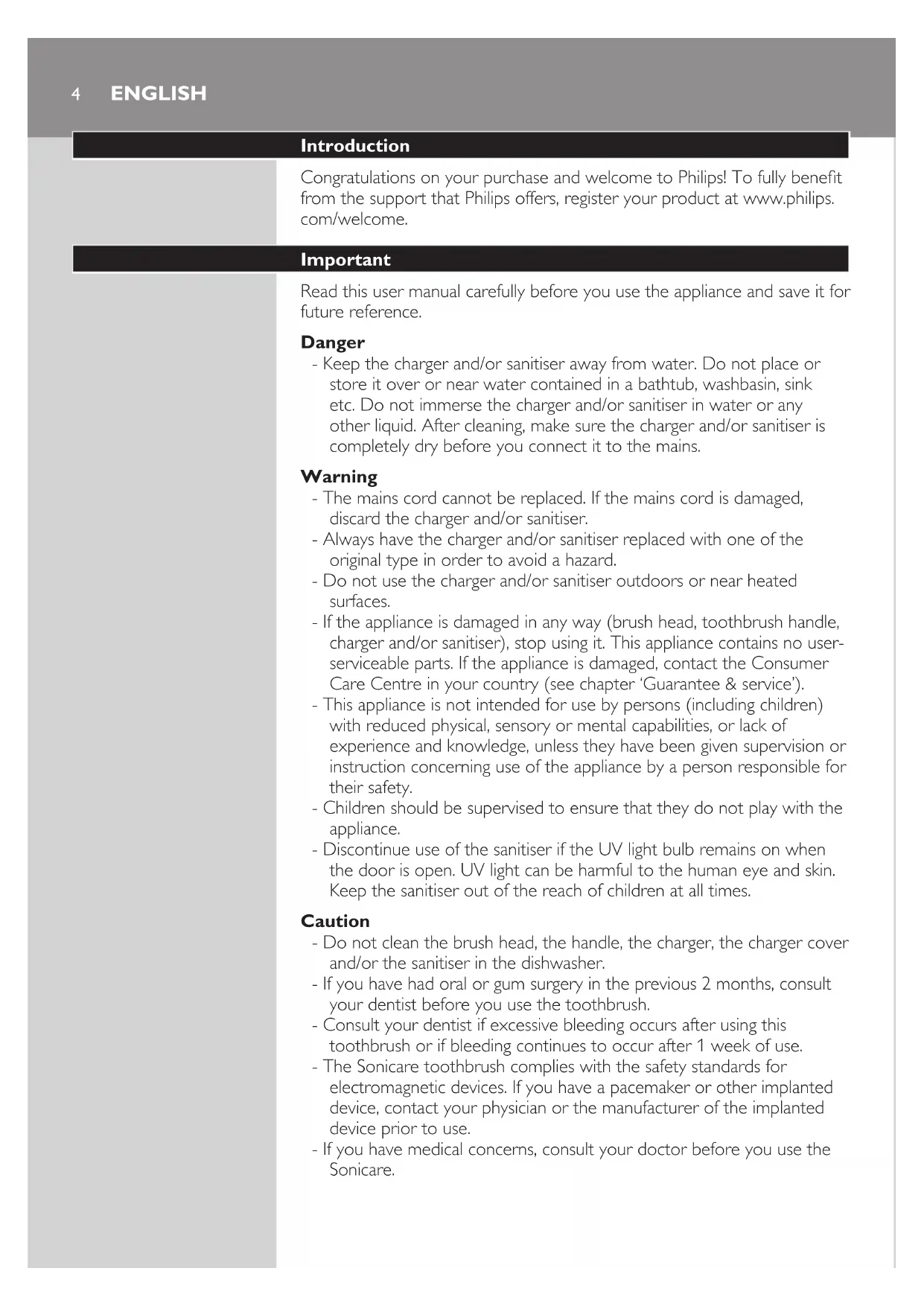 1HX6996,HX6995,HX6992,HX6972,HX6962,HX6942 EnglisH 4 DEutscH 15 Français 27 italiano 39 nEDErlanDs 514 Introduction Congratulations on your purchase and welcome to Philips! To fully benet from the support that Philips offers, register your product at www.philips. com/welcome. Important Read this user manual carefully before you use the appliance and save it for future reference. Danger - Keep the charger and/or sanitiser away from water. Do not place or store it over or near water contained in a bathtub, washbasin, sink etc. Do not immerse the charger and/or sanitiser in water or any other liquid. After cleaning, make sure the charger and/or sanitiser is completely dry before you connect it to the mains. Warning - The mains cord cannot be replaced. If the mains cord is damaged, discard the charger and/or sanitiser. - Always have the charger and/or sanitiser replaced with one of the original type in order to avoid a hazard. - Do not use the charger and/or sanitiser outdoors or near heated surfaces. - If the appliance is damaged in any way (brush head, toothbrush handle, charger and/or sanitiser), stop using it. This appliance contains no user- serviceable parts. If the appliance is damaged, contact the Consumer Care Centre in your country (see chapter ‘Guarantee & service’). - This appliance is not intended for use by persons (including children) with reduced physical, sensory or mental capabilities, or lack of experience and knowledge, unless they have been given supervision or instruction concerning use of the appliance by a person responsible for their safety. - Children should be supervised to ensure that they do not play with the appliance. - Discontinue use of the sanitiser if the UV light bulb remains on when the door is open. UV light can be harmful to the human eye and skin. Keep the sanitiser out of the reach of children at all times. Caution - Do not clean the brush head, the handle, the charger, the charger cover and/or the sanitiser in the dishwasher. - If you have had oral or gum surgery in the previous 2 months, consult your dentist before you use the toothbrush. - Consult your dentist if excessive bleeding occurs after using this toothbrush or if bleeding continues to occur after 1 week of use. - The Sonicare toothbrush complies with the safety standards for electromagnetic devices. If you have a pacemaker or other implanted device, contact your physician or the manufacturer of the implanted device prior to use. - If you have medical concerns, consult your doctor before you use the Sonicare. ENGLISH- This appliance has only been designed for cleaning teeth, gums and tongue. Do not use it for any other purpose. Stop using the appliance and contact your doctor if you experience any discomfort or pain. - Do not use other brush heads than the ones recommended by the manufacturer. - If your toothpaste contains peroxide, baking soda or bicarbonate (common in whitening toothpastes), thoroughly clean the brush head with soap and water after each use. This prevents possible cracking of the plastic. - The UV light bulb is hot during and immediately after the sanitising cycle. Do not touch the UV light bulb when it is hot. - Do not operate the sanitiser without the protective screen in place to avoid contact with a hot bulb. Electromagnetic elds (EMF) This Philips appliance complies with all standards regarding electromagnetic elds (EMF). If handled properly and according to the instructions in this user manual, the appliance is safe to use based on scientic evidence available today. General description (Fig. 1) A Hygienic travel cap B Brush head C Interchangeable colour code ring D Handle with soft grip E Power on/off button F Mode button G Brushing modes H Deluxe recharge gauge I UV sanitiser base with integrated charger and cord wrap (specic types only) J UV sanitiser (specic types only) K Deluxe charger (specic types only) L Charger cover with brush head holder M Travel charger N Charger base with cord wrap - Not shown: UV light bulb - Not shown: Sanitiser drip tray - Not shown: Protective screen for UV light bulb Preparing for use Changing the colour code ring Sonicare brush heads come with interchangeable colour code rings to identify your brush head. To change the colour code ring: ENGLISH 51 Pull the colour code ring from the bottom of the brush head. 2 Install a new ring by slipping one edge of the new ring over the bottom of the brush head. Attaching the brush head 1 Align the brush head so the bristles face the front of the handle. 2 Firmly press the brush head down on the metal shaft until it stops. Note: There is a small gap between the colour code ring and the handle. Charging your Sonicare 1 Put the mains plug of the charger or sanitiser in the wall socket. 2 Place the handle on the charger or sanitiser. , The ashing light of the battery gauge indicates that the toothbrush is charging. - 1 solid green LED indicates that the toothbrush is 34-66% charged. - 2 solid green LEDs indicate that the toothbrush is 67-94% charged. - 3 solid green LEDs indicate that the toothbrush is fully charged. Note: If the battery charge of your Sonicare is low, you hear 3 beeps and 1 LED of the recharge gauge ashes yellow for 30 seconds after completing the brushing cycle. Note: To keep the battery fully charged at all times, you may keep your Sonicare on the charger when not in use. Once the Sonicare is fully charged, the charger draws minimal energy from the wall socket. Note: It takes at least 24 hours to fully charge the battery. ENGLISH6Using the Sonicare Brushing instructions 1 Wet the bristles and apply a small amount of toothpaste. 2 Place the toothbrush bristles against the teeth at a slight angle towards the gumline. 3 Press the power on/off button to switch on the Sonicare. 4 Apply light pressure to maximise Sonicare’s effectiveness and let the Sonicare toothbrush do the brushing for you. Do not scrub. 5 Gently move the brush head slowly across the teeth in a small back an