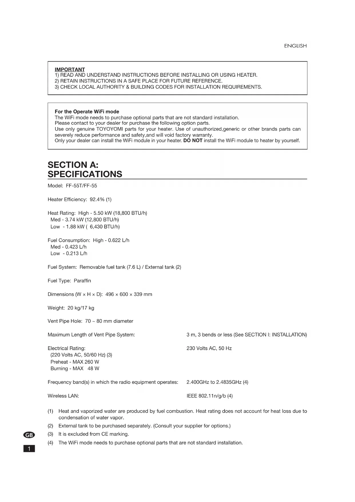 For the Operate WiFi mode The WiFi mode needs to purchase optional parts that are not standard installation. Please contact to your dealer for purchase the following option parts. Use only genuine TOYOYOMI parts for your heater. Use of unauthorized,generic or other brands parts can severely reduce performance and safety,and will void factory warranty. Only your dealer can install the WiFi module in your heater. DO NOT install the WiFi module to heater by yourself. SECTION A: SPECIFICATIONS Model: FF-55T/FF-55 Heater Efficiency: 92.4% (1) Heat Rating: High - 5.50 kW (18,800 BTU/h) Med - 3.74 kW (12,800 BTU/h) Low - 1.88 kW ( 6,430 BTU/h) Fuel Consumption: High - 0.622 L/h Med - 0.423 L/h Low - 0.213 L/h Fuel System: Removable fuel tank (7.6 L) / External tank (2) Fuel Type: Paraffin Dimensions (W × H × D): 496 × 600 × 339 mm Weight: 20 kg/17 kg Vent Pipe Hole: 70 ~ 80 mm diameter Maximum Length of Vent Pipe System: 3 m, 3 bends or less (See SECTION I: INSTALLATION) Electrical Rating: 230 Volts AC, 50 Hz (220 Volts AC, 50/60 Hz) (3) Preheat - MAX 260 W Burning - MAX 48 W Frequency band(s) in which the radio equipment operates: 2.400GHz to 2.4835GHz (4) Wireless LAN: IEEE 802.11n/g/b (4) (1) Heat and vaporized water are produced by fuel combustion. Heat rating does not account for heat loss due to condensation of water vapor. (2) External tank to be purchased separately. (Consult your supplier for options.) (3) It is excluded from CE marking. (4) The WiFi mode needs to purchase optional parts that are not standard installation.GB ENGLISH