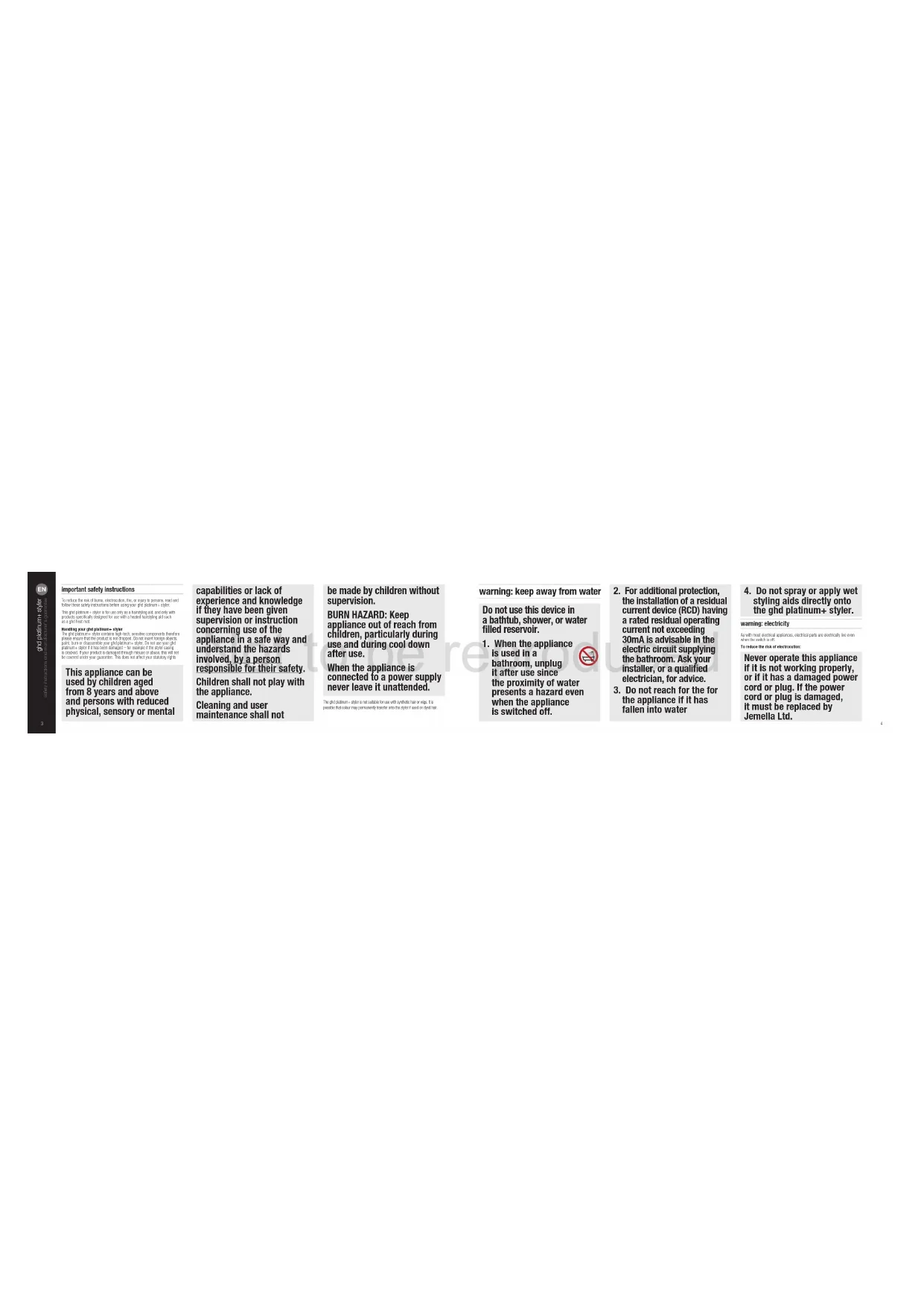 As with most electrical appliances, electrical parts are electrically live even when the switch is o.To reduce the risk of electrocution: Never operate this appliance if it is not working properly, or if it has a damaged power cord or plug. If the power cord or plug is damaged, it must be replaced by Jemella Ltd. ghd platinum+ styler safety instructions and manufacturer’s guarantee