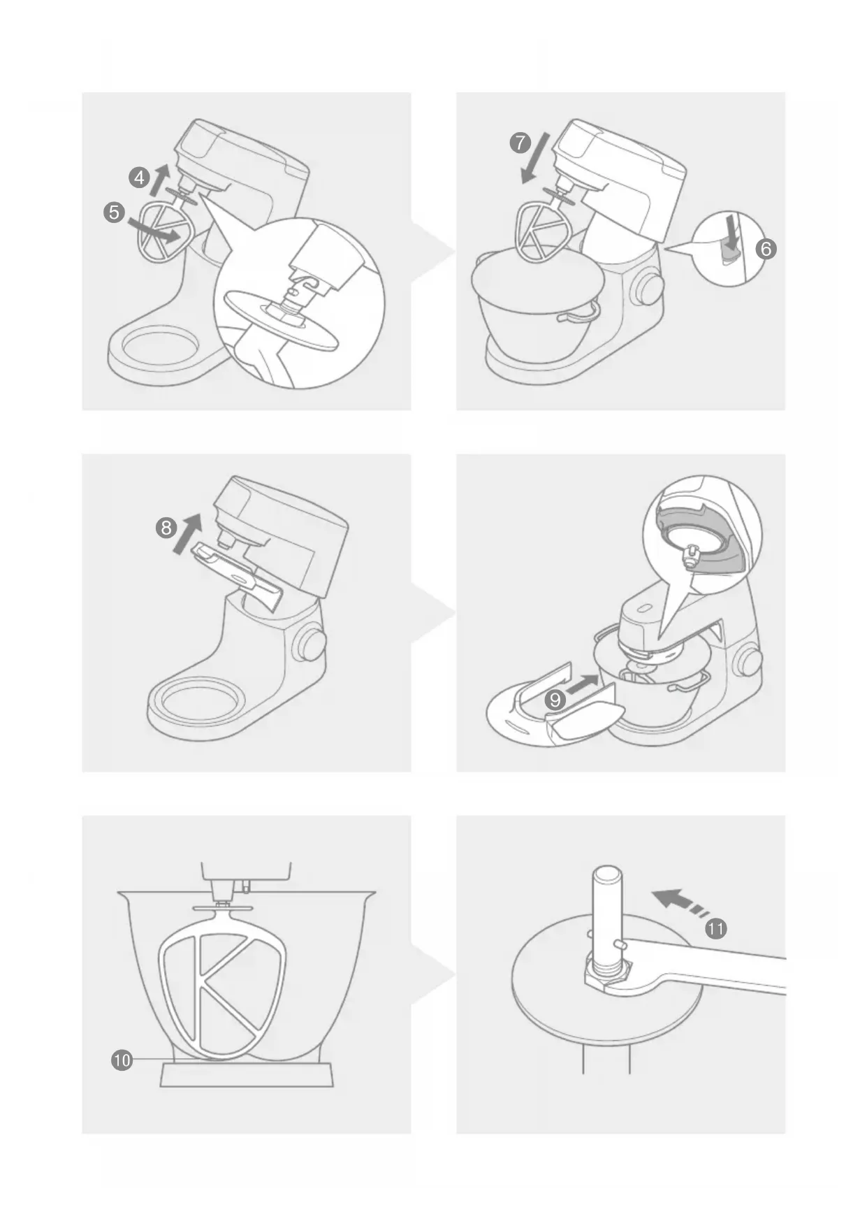 - During mixing, ingredients can be added directly to the bowl via the feed chute. 6 To remove the splashguard simply slide it away from the mixer bowl. 7 To remove the head shield, raise the mixer head until it locks. Remove the tool if fitted, then pull the head shield downwards from the underside of the mixer head. Note: Only fit or remove the splashguard when the mixer head is in the locked position. We recommend that the head shield is removed regularly from the mixer head for cleaning. K-beater & Whisk The tools are set to the correct height for the bowl supplied in the factory and should not require adjustment. However, if you wish to adjust the tool use a suitable sized spanner: TYPE KQC51 = 15mm TYPE KQL61 = 19mm Then follow the instructions below: 1 Unplug the appliance. 2 Raise the mixer head and insert the whisk or beater. 3 Lower the mixer head. If the clearance needs to be adjusted, raise the mixer head and remove the tool. Ideally the whisk and K-beater should be almost touching the bottom of the bowl