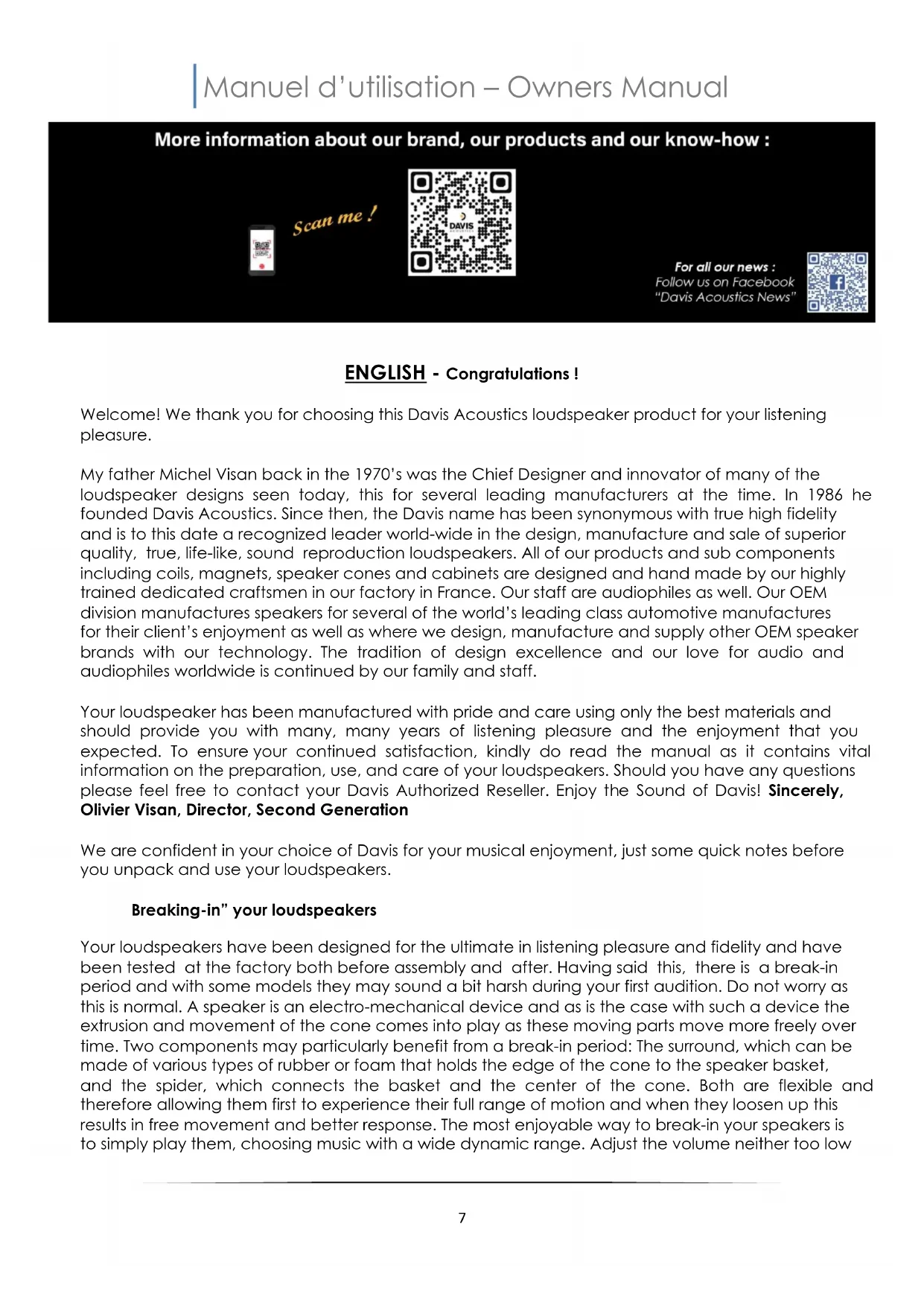 ENGLISH - Congratulations ! Welcome! We thank you for choosing this Davis Acoustics loudspeaker product for your listening pleasure. My father Michel Visan back in the 1970’s was the Chief Designer and innovator of many of the loudspeaker designs seen today, this for several leading manufacturers at the time. In 1986 he founded Davis Acoustics. Since then, the Davis name has been synonymous with true high fidelity and is to this date a recognized leader world-wide in the design, manufacture and sale of superior quality, true, life-like, sound reproduction loudspeakers. All of our products and sub components including coils, magnets, speaker cones and cabinets are designed and hand made by our highly trained dedicated craftsmen in our factory in France. Our staff are audiophiles as well. Our OEM division manufactures speakers for several of the world’s leading class automotive manufactures for their client’s enjoyment as well as where we design, manufacture and supply other OEM speaker brands with our technology. The tradition of design excellence and our love for audio and audiophiles worldwide is continued by our family and staff. Your loudspeaker has been manufactured with pride and care using only the best materials and should provide you with many, many years of listening pleasure and the enjoyment that you expected. To ensure your continued satisfaction, kindly do read the manual as it contains vital information on the preparation, use, and care of your loudspeakers. Should you have any questions please feel free to contact your Davis Authorized Reseller. Enjoy the Sound of Davis! Sincerely, Olivier Visan, Director, Second Generation We are confident in your choice of Davis for your musical enjoyment, just some quick notes before you unpack and use your loudspeakers. Breaking-in” your loudspeakers Your loudspeakers have been designed for the ultimate in listening pleasure and fidelity and have been tested at the factory both before assembly and after. Having said this, there is a break-in period and with some models they may sound a bit harsh during your first audition. Do not worry as this is normal. A speaker is an electro-mechanical device and as is the case with such a device the extrusion and movement of the cone comes into play as these moving parts move more freely over time. Two components may particularly benefit from a break-in period: The surround, which can be made of various types of rubber or foam that holds the edge of the cone to the speaker basket, and the spider, which connects the basket and the center of the cone. Both are flexible and therefore allowing them first to experience their full range of motion and when they loosen up this results in free movement and better response. The most enjoyable way to break-in your speakers is to simply play them, choosing music with a wide dynamic range. Adjust the volume neither too lowManuel d’utilisation – Owners Manual