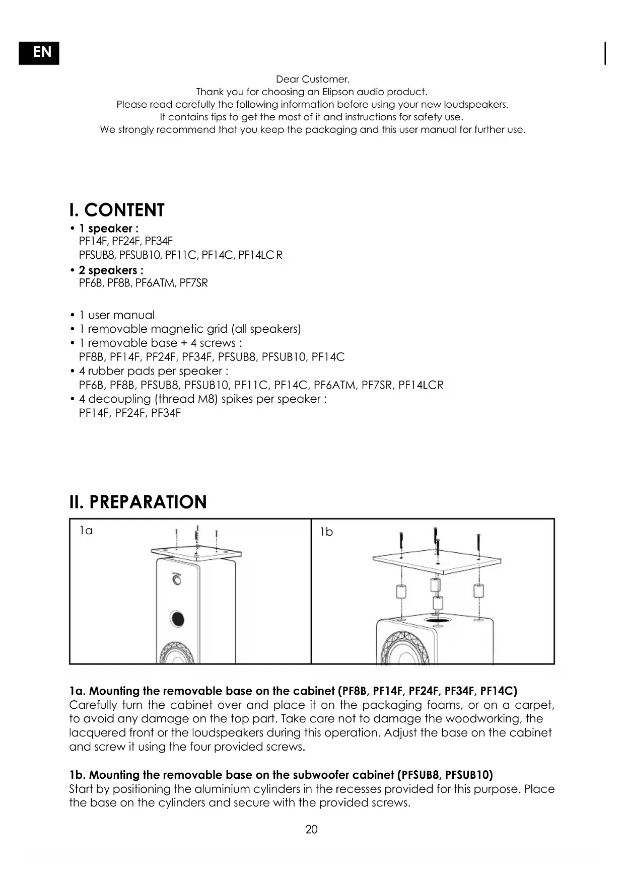 - 4 decoupling (thread M8) spikes per speaker : PF14F, PF24F, PF34F 1a. Mounting the removable base on the cabinet (PF8B, PF14F, PF24F, PF34F, PF14C) Carefully turn the cabinet over and place it on the packaging foams, or on a carpet, to avoid any damage on the top part. Take care not to damage the woodworking, the lacquered front or the loudspeakers during this operation. Adjust the base on the cabinet and screw it using the four provided screws. 1b. Mounting the removable base on the subwoofer cabinet (PFSUB8, PFSUB10) Start by positioning the aluminium cylinders in the recesses provided for this purpose. Place the base on the cylinders and secure with the provided screws.