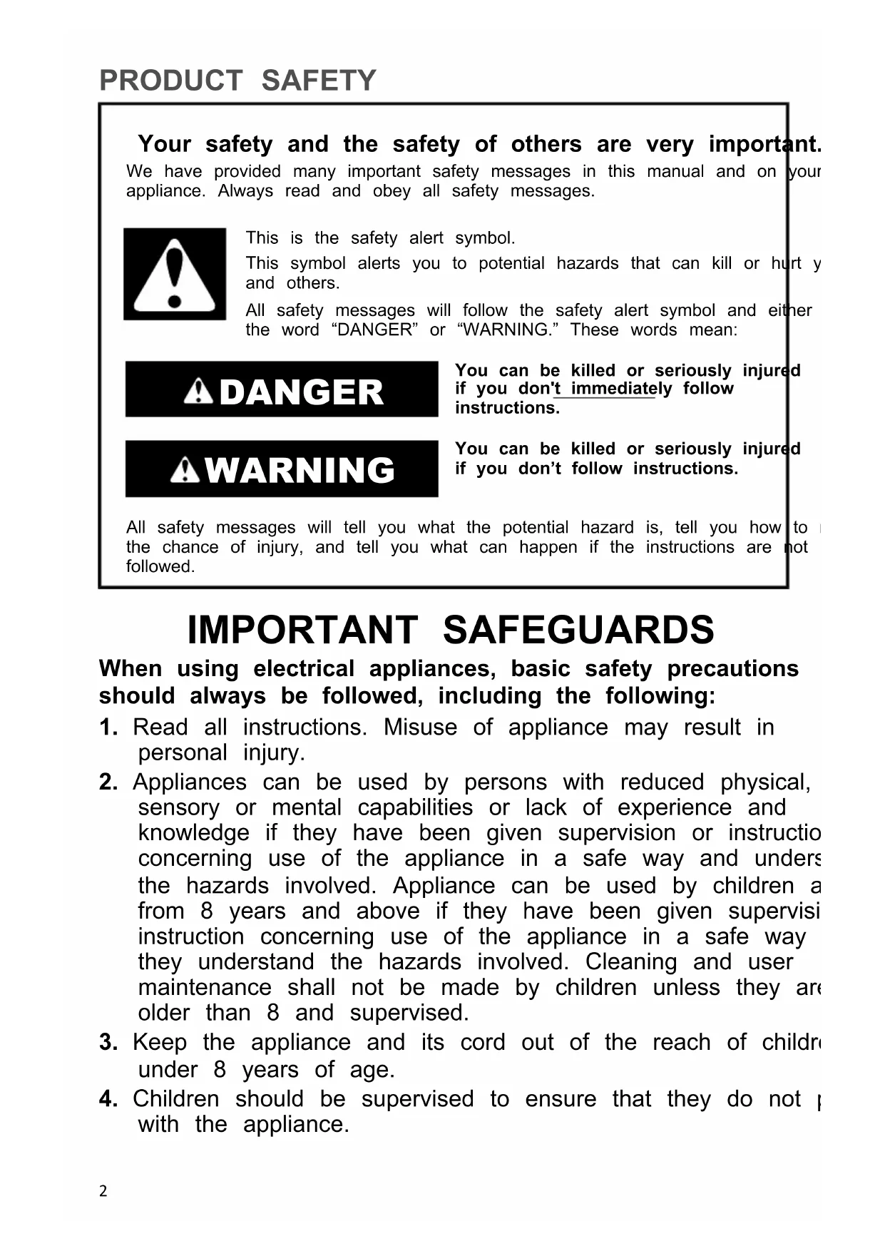 PRODUCT SAFETY Your safety and the safety of others are very important. We have provided many important safety messages in this manual and on your appliance. Always read and obey all safety messages. This is the safety alert symbol. This symbol alerts you to potential hazards that can kill or hurt you and others. All safety messages will follow the safety alert symbol and either the word “DANGER” or “WARNING.” These words mean: DANGER You can be killed or seriously injured if you don't immediately follow instructions. WARNING You can be killed or seriously injured if you don’t follow instructions. All safety messages will tell you what the potential hazard is, tell you how to reduce the chance of injury, and tell you what can happen if the instructions are not followed. IMPORTANT SAFEGUARDS When using electrical appliances, basic safety precautions should always be followed, including the following:
