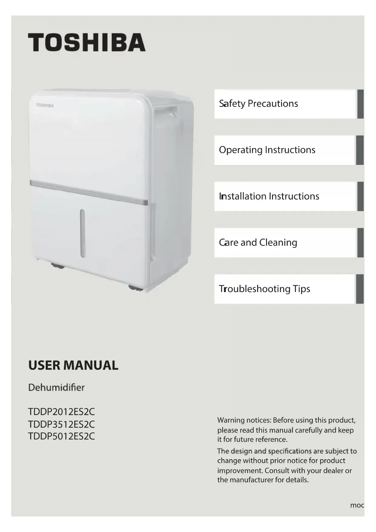 Download the instructions for your Humidifier in PDF format for free! Find your manual TDDP2012ES2C - TOSHIBA and take your electronic device back in hand. On this page are published all the documents necessary for the use of your device. TDDP2012ES2C by TOSHIBA.