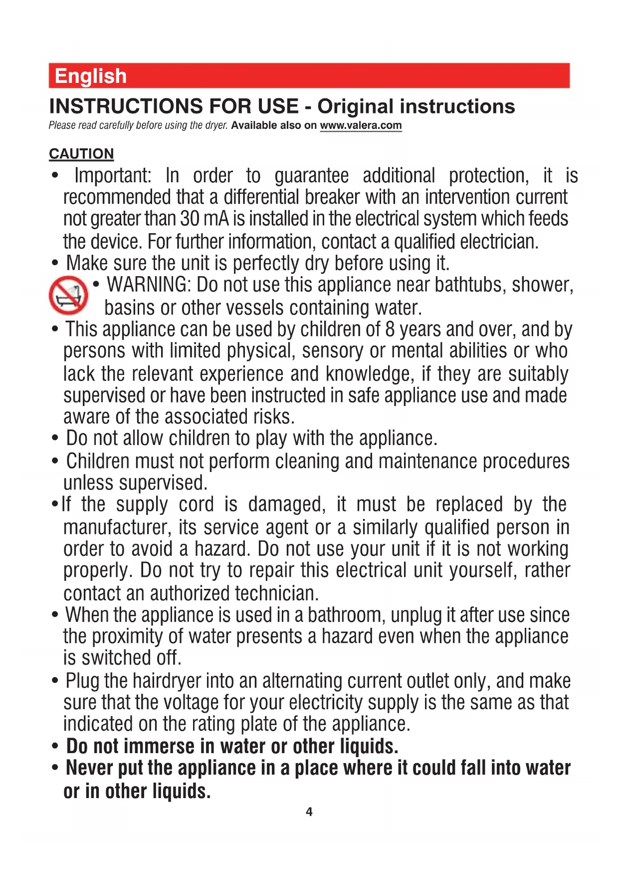 INSTRUCTIONS FOR USE - Original instructions Please read carefully before using the dryer. Available also on www.valera.com CAUTION