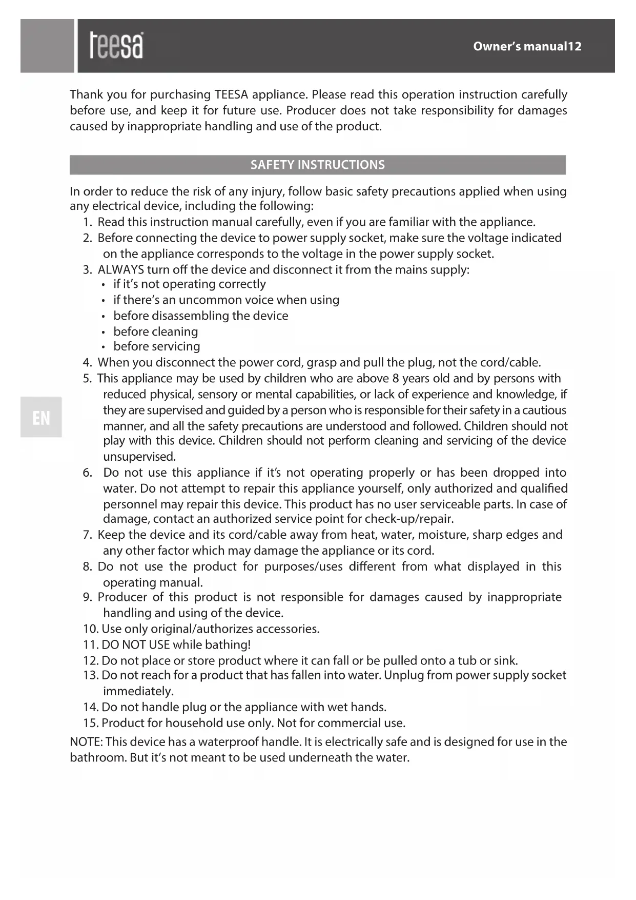 NOTE: This device has a waterproof handle. It is electrically safe and is designed for use in the bathroom.Butit’snotmeanttobeusedunderneaththewater.Owner’s manual 13