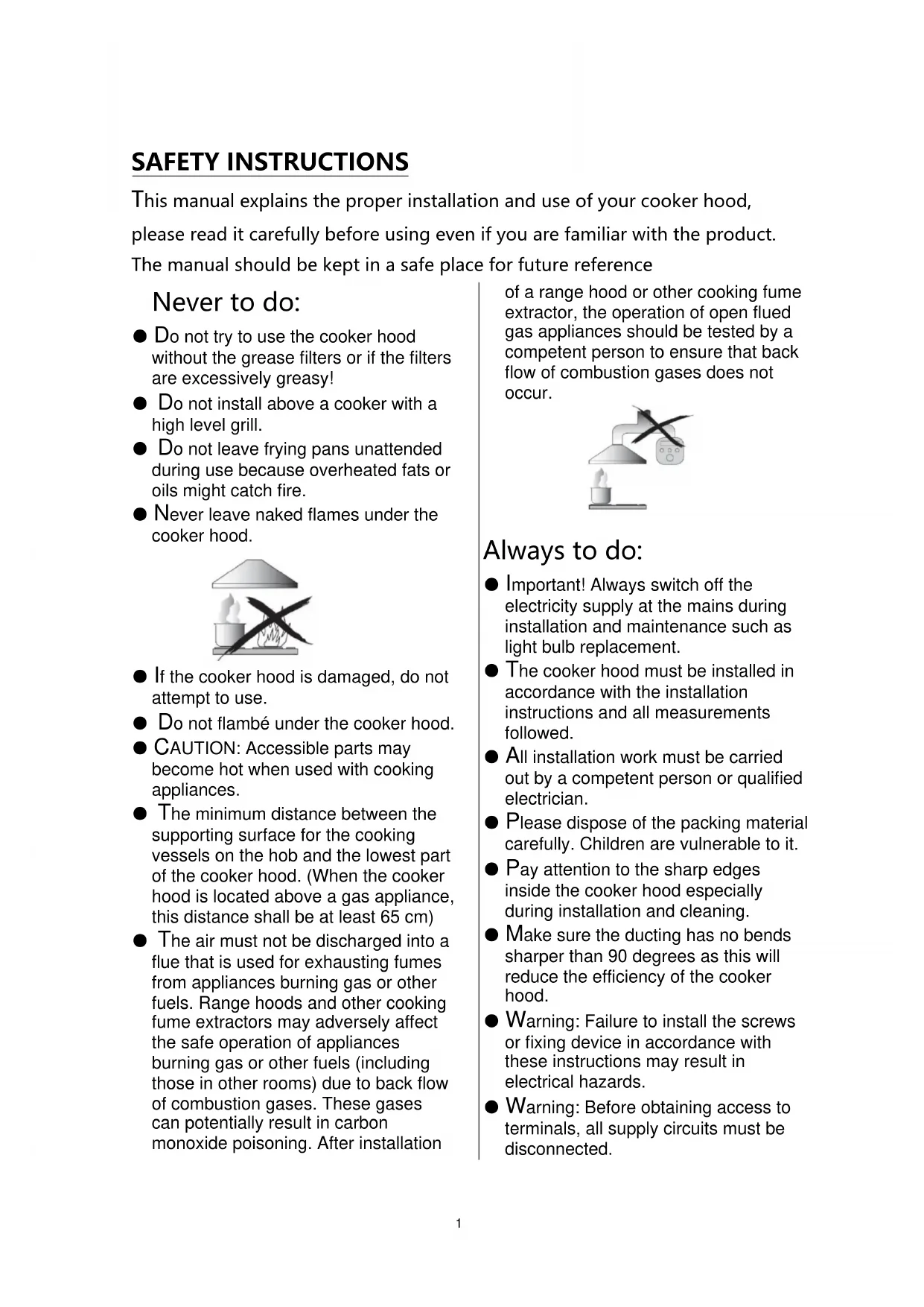 16SAFETY INSTRUCTIONS This manual explains the proper installation and use of your cooker hood, please read it carefully before using even if you are familiar with the product. The manual should be kept in a safe place for future reference Never to do: ● Do not try to use the cooker hood without the grease filters or if the filters are excessively greasy! ● Do not install above a cooker with a high level grill. ● Do not leave frying pans unattended during use because overheated fats or oils might catch fire. ● Never leave naked flames under the cooker hood. ● If the cooker hood is damaged, do not attempt to use. ● Do not flambé under the cooker hood. ● CAUTION: Accessible parts may become hot when used with cooking appliances. ● The minimum distance between the supporting surface for the cooking vessels on the hob and the lowest part of the cooker hood. (When the cooker hood is located above a gas appliance, this distance shall be at least 65 cm) ● The air must not be discharged into a flue that is used for exhausting fumes from appliances burning gas or other fuels. Range hoods and other cooking fume extractors may adversely affect the safe operation of appliances burning gas or other fuels (including those in other rooms) due to back flow of combustion gases. These gases can potentially result in carbon monoxide poisoning. After installation of a range hood or other cooking fume extractor, the operation of open flued gas appliances should be tested by a competent person to ensure that back flow of combustion gases does not occur. Always to do: ● Important! Always switch off the electricity supply at the mains during installation and maintenance such as light bulb replacement. ● The cooker hood must be installed in accordance with the installation instructions and all measurements followed. ● All installation work must be carried out by a competent person or qualified electrician. ● Please dispose of the packing material carefully. Children are vulnerable to it. ● Pay attention to the sharp edges inside the cooker hood especially during installation and cleaning. ● Make sure the ducting has no bends sharper than 90 degrees as this will reduce the efficiency of the cooker hood. ● Warning: Failure to install the screws or fixing device in accordance with these instructions may result in electrical hazards. ● Warning: Before obtaining access to terminals, all supply circuits must be disconnected. 17● If the voltage rating of the lamp is less than the rated voltage of the appliance, the voltage rating of the lamp shall also be marked on or near the lamp holder. Always to do: ● Always put lids on pots and pans when cooking on a gas cooker. ● When in extraction mode, air in the room is being removed by the cooker hood. Please make sure that proper ventilation measures are being observed. The cooker hood removes odours from room but not steam. ● There shall be adequate ventilation of the room when the cooker hood is used at the same time as appliances burning gas or other fuels. ● Cooker hood is for domestic use only.