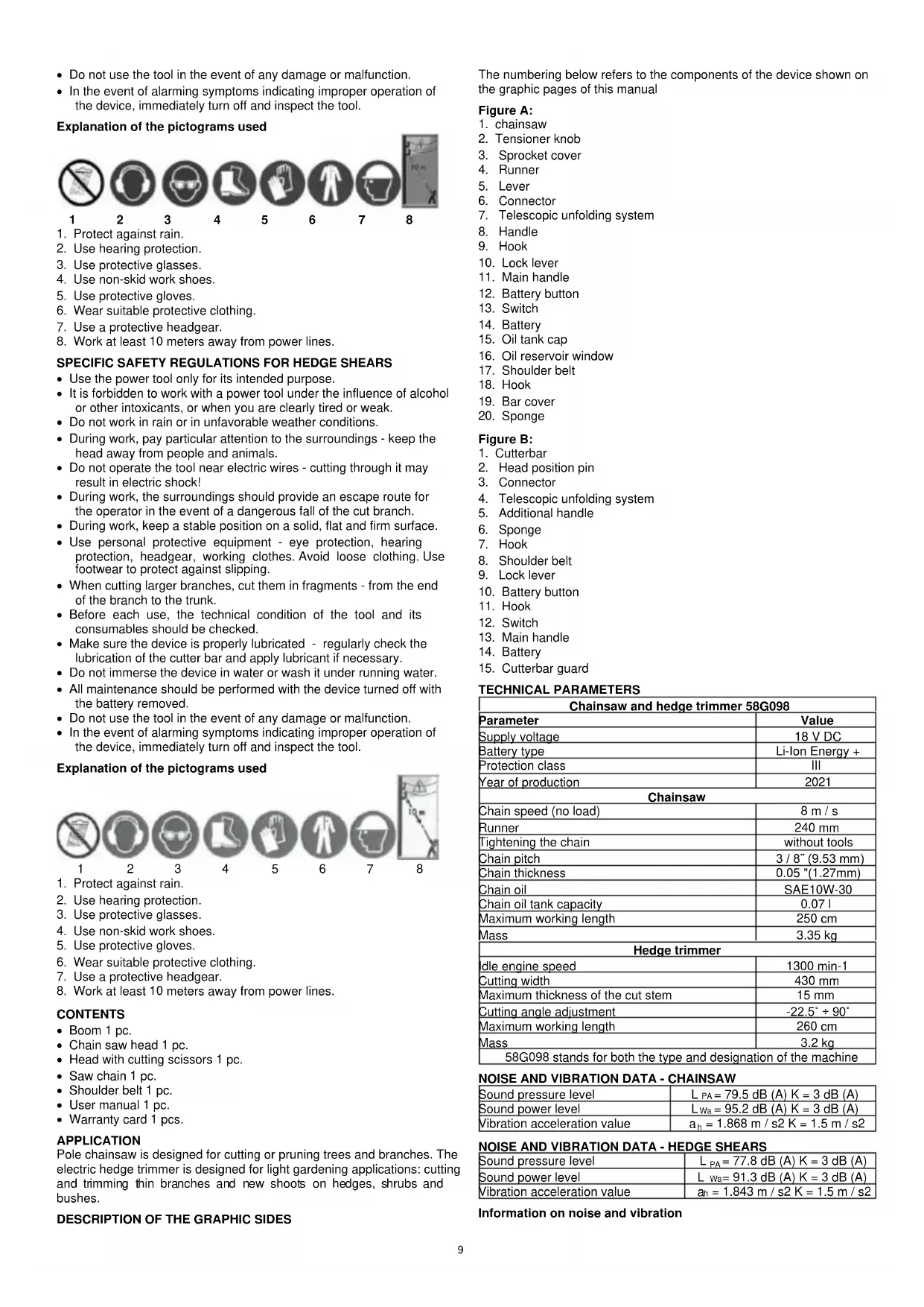 can be used for the comparison of devices and for the initial assessment of vibration exposure. The stated vibration level is representative only for the basic use of the device. If the machine is used for different applications or with different working tools, the vibration level may change. The higher level of vibrations will be influenced by insufficient or too rare maintenance of the device. The reasons given above may result in an increased exposure to vibration during the entire period of operation. To accurately estimate exposure to vibration, consider periods when the equipment is turned off or when it is turned on but not in use. After all factors have been carefully assessed, the overall vibration exposure may be significantly lower. In order to protect the user against the effects of vibrations, additional safety measures should be implemented, such as: periodic maintenance of the device and working tools, protection of the appropriate temperature of hands and proper organization of work.