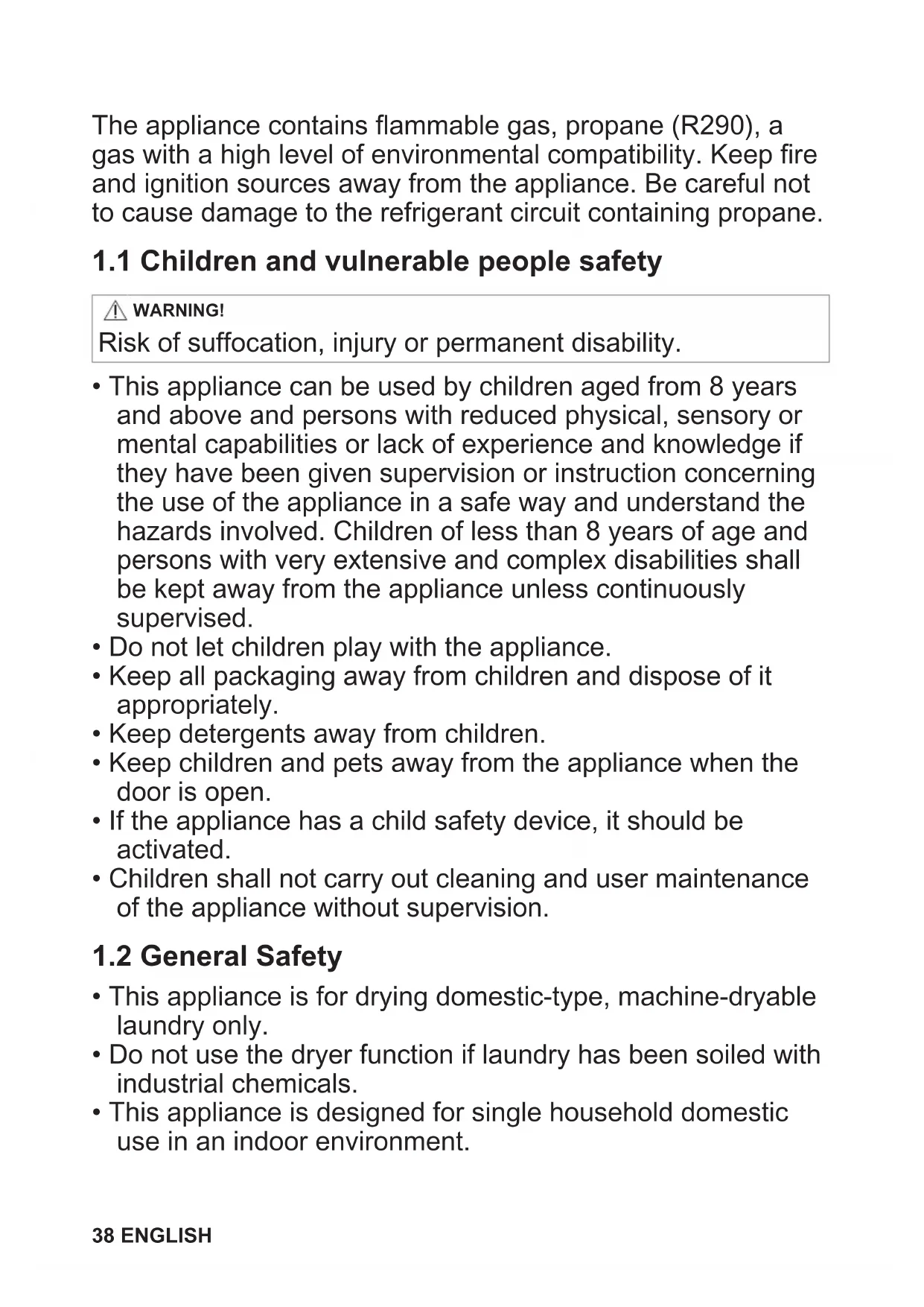 ENGLISH 37The appliance contains flammable gas, propane (R290), a gas with a high level of environmental compatibility. Keep fire and ignition sources away from the appliance. Be careful not to cause damage to the refrigerant circuit containing propane.