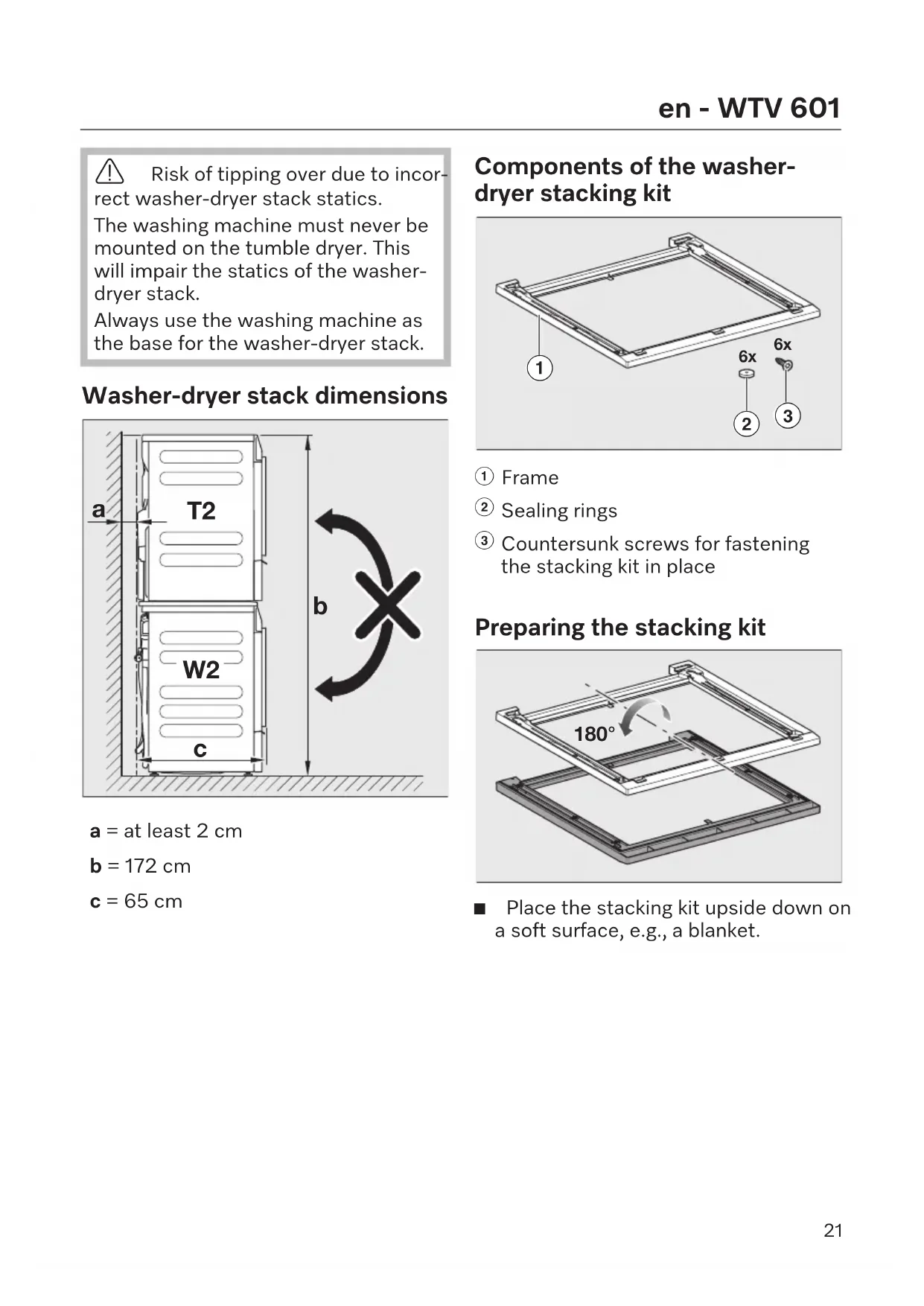 την τοποθέτηση νέου καπακιού. 20en - WTV601 Risk of tipping over due to incor- rect washer-dryer stack statics. The washing machine must never be mounted on the tumble dryer. This will impair the statics of the washer- dryer stack. Always use the washing machine as the base for the washer-dryer stack. Washer-dryer stack dimensions