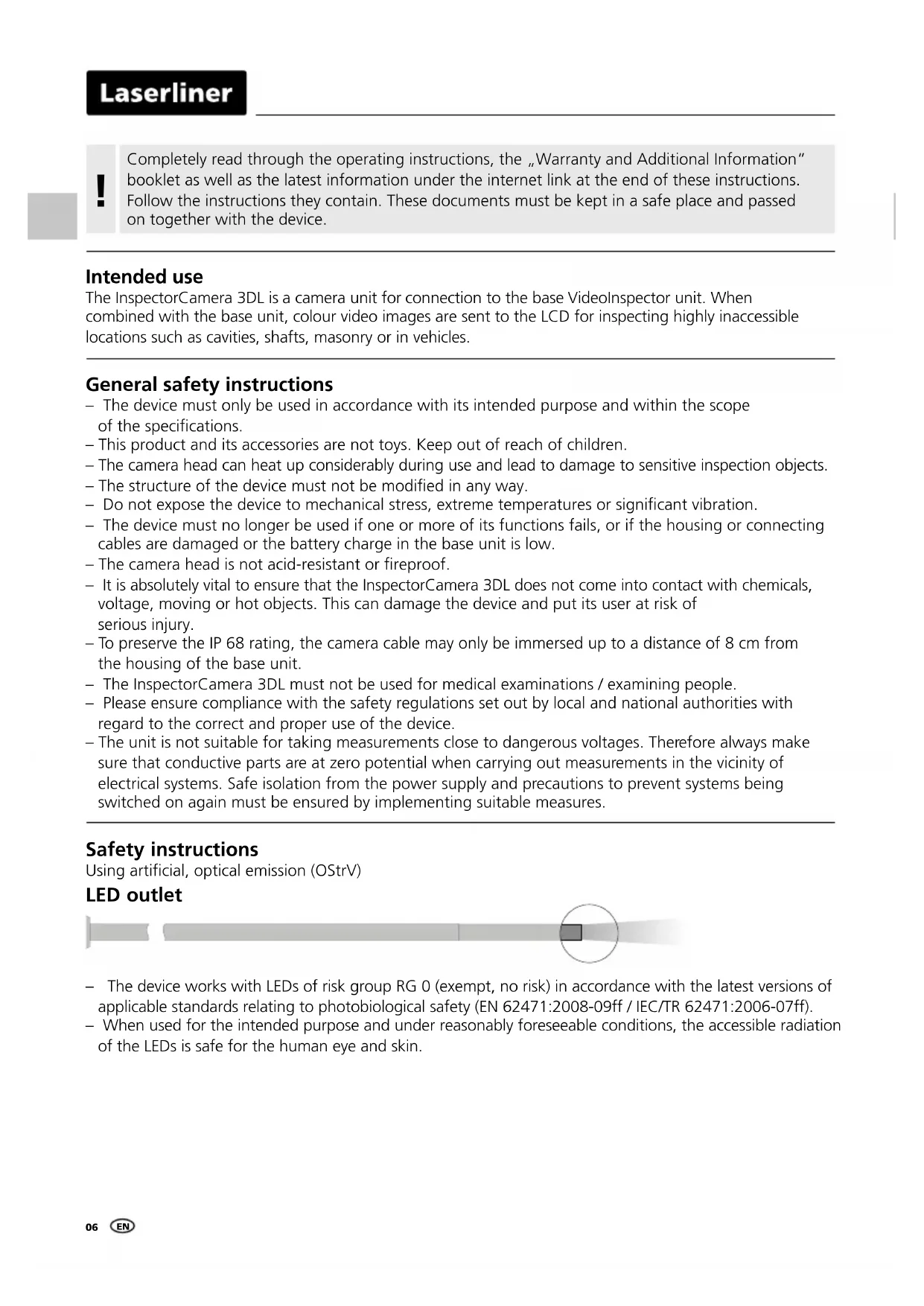 Safety instructions Using artificial, optical emission (OStrV) LED outlet – The device works with LEDs of risk group RG 0 (exempt, no risk) in accordance with the latest versions of applicable standards relating to photobiological safety (EN 62471:2008-09ff / IEC/TR 62471:2006-07ff). – When used for the intended purpose and under reasonably foreseeable conditions, the accessible radiation of the LEDs is safe for the human eye and skin. General safety instructions – The device must only be used in accordance with its intended purpose and within the scope of the specications. – This product and its accessories are not toys. Keep out of reach of children. – The camera head can heat up considerably during use and lead to damage to sensitive inspection objects. – The structure of the device must not be modied in any way. – Do not expose the device to mechanical stress, extreme temperatures or signicant vibration. – The device must no longer be used if one or more of its functions fails, or if the housing or connecting cables are damaged or the battery charge in the base unit is low. – The camera head is not acid-resistant or reproof. – It is absolutely vital to ensure that the InspectorCamera 3DL does not come into contact with chemicals, voltage, moving or hot objects. This can damage the device and put its user at risk of serious injury. – To preserve the IP 68 rating, the camera cable may only be immersed up to a distance of 8 cm from the housing of the base unit. – The InspectorCamera 3DL must not be used for medical examinations / examining people. – Please ensure compliance with the safety regulations set out by local and national authorities with regard to the correct and proper use of the device. – The unit is not suitable for taking measurements close to dangerous voltages. Therefore always make sure that conductive parts are at zero potential when carrying out measurements in the vicinity of electrical systems. Safe isolation from the power supply and precautions to prevent systems being switched on again must be ensured by implementing suitable measures. ENInspectorCamera 3DL