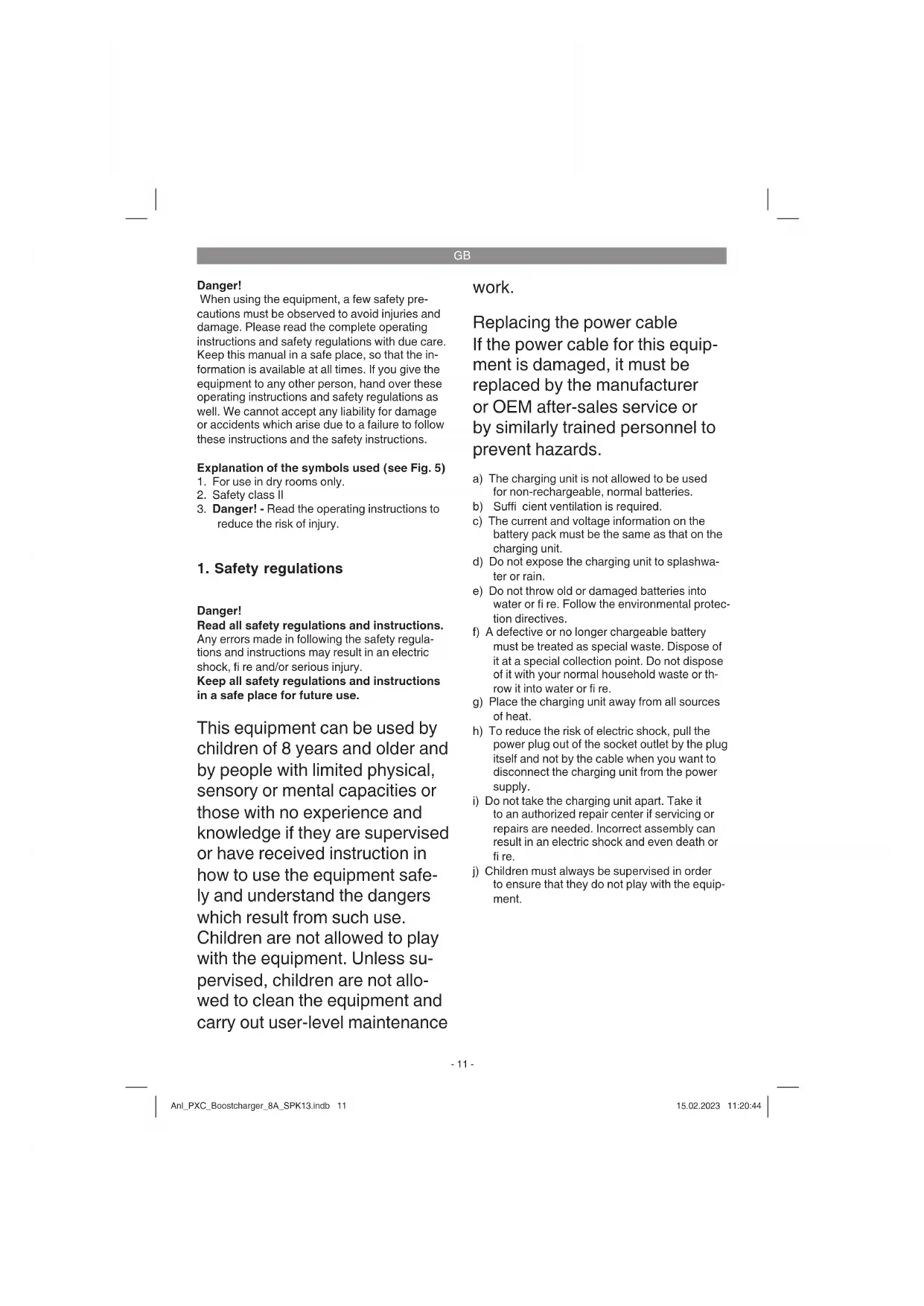 to an authorized repair center if servicing or repairs are needed. Incorrect assembly can result in an electric shock and even death or fi re. j) Children must always be supervised in order to ensure that they do not play with the equip- ment. Anl_PXC_Boostcharger_8A_SPK13.indb 11Anl_PXC_Boostcharger_8A_SPK13.indb 11 15.02.2023 11:20:4415.02.2023 11:20:44GB