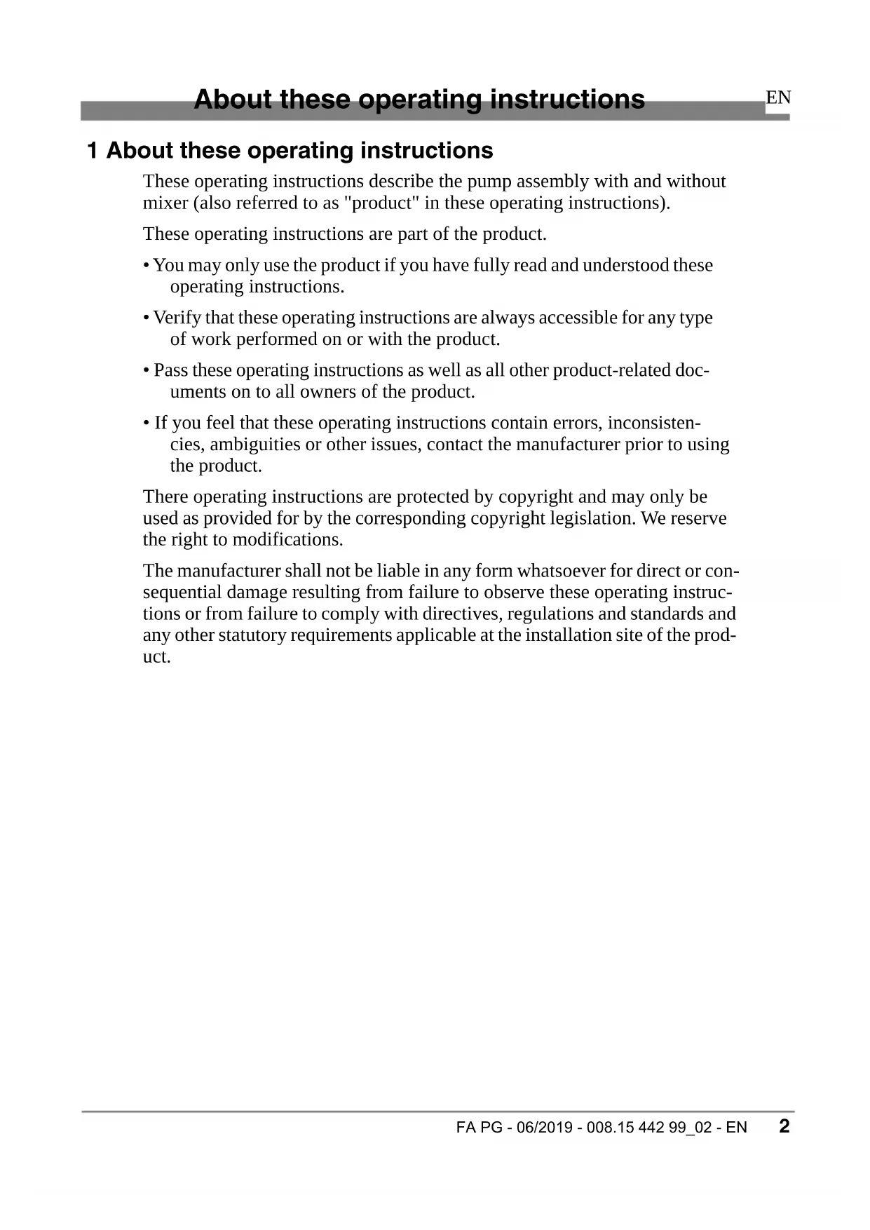 FA PG - 06/2019 - 008.15 442 99_02 - EN 1 About these operating instructions These operating instructions describe the pump assembly with and without mixer (also referred to as "product" in these operating instructions). These operating instructions are part of the product.