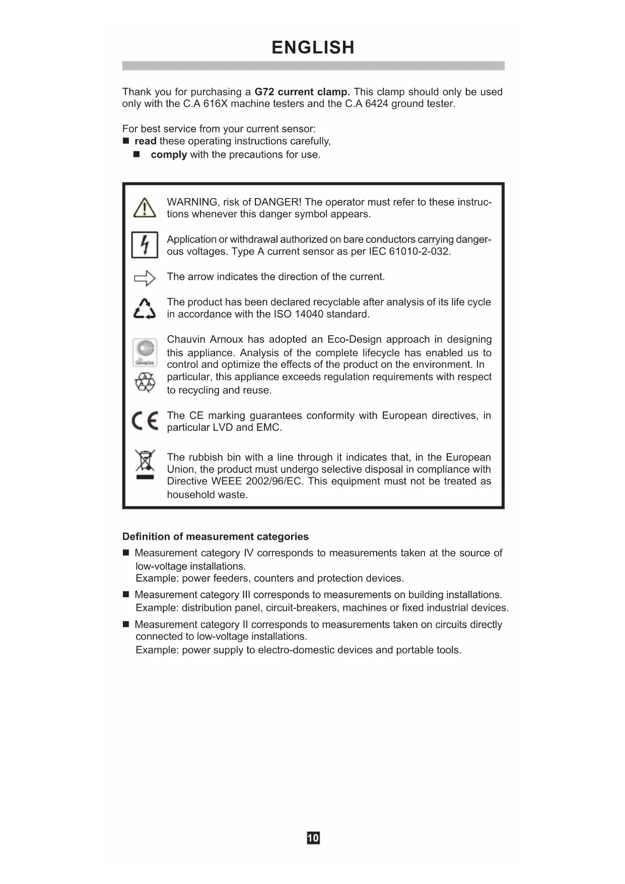 1.1. CLAMPS G72 Detachable arm. Fixed arm. Special 4-point plug. Trigger. Shielded cord. Guard. Arrow identify- ing the direction of the current.13 Current clamps are used to measure the current owing in a cable without opening the circuit. They also insulate the user from dangerous voltages in the circuit. The G72 clamp can measure AC leakage currents up to 50A, at the usual industrial frequencies. It is based on the current transformer principle. Its ergonomic shape and small size make it ideal for measurements in electrical cabinets, distribution frames, and cable assemblies. 1.2. DELIVERY CONDITION The clamp is supplied in a cardboard box with : a Velcro fastener, a user manual in 5 languages, a verication certicate.