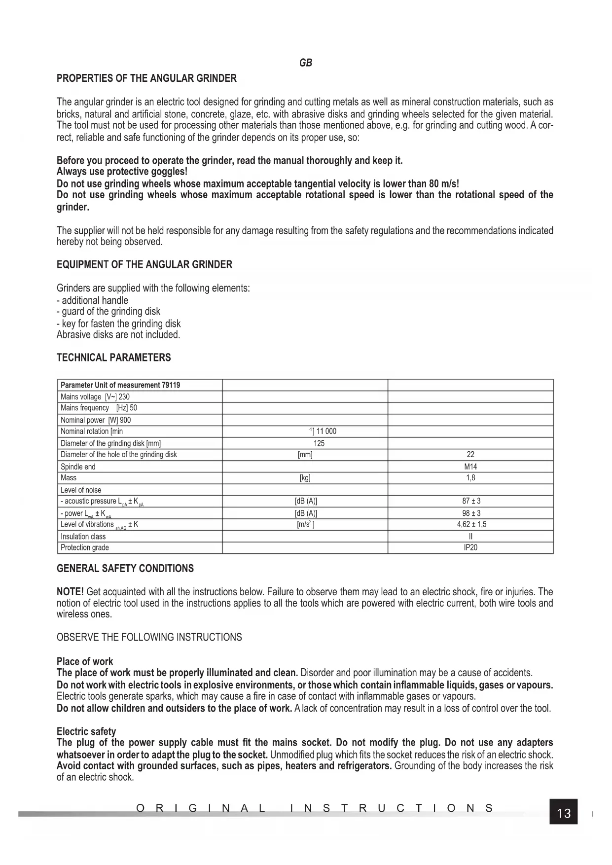 Grinders are supplied with the following elements: - additional handle - guard of the grinding disk - key for fasten the grinding disk Abrasive disks are not included. TECHNICAL PARAMETERS Parameter Unit of measurement 79119 Mains voltage [V~] 230 Mains frequency [Hz] 50 Nominal power [W] 900 Nominal rotation [min