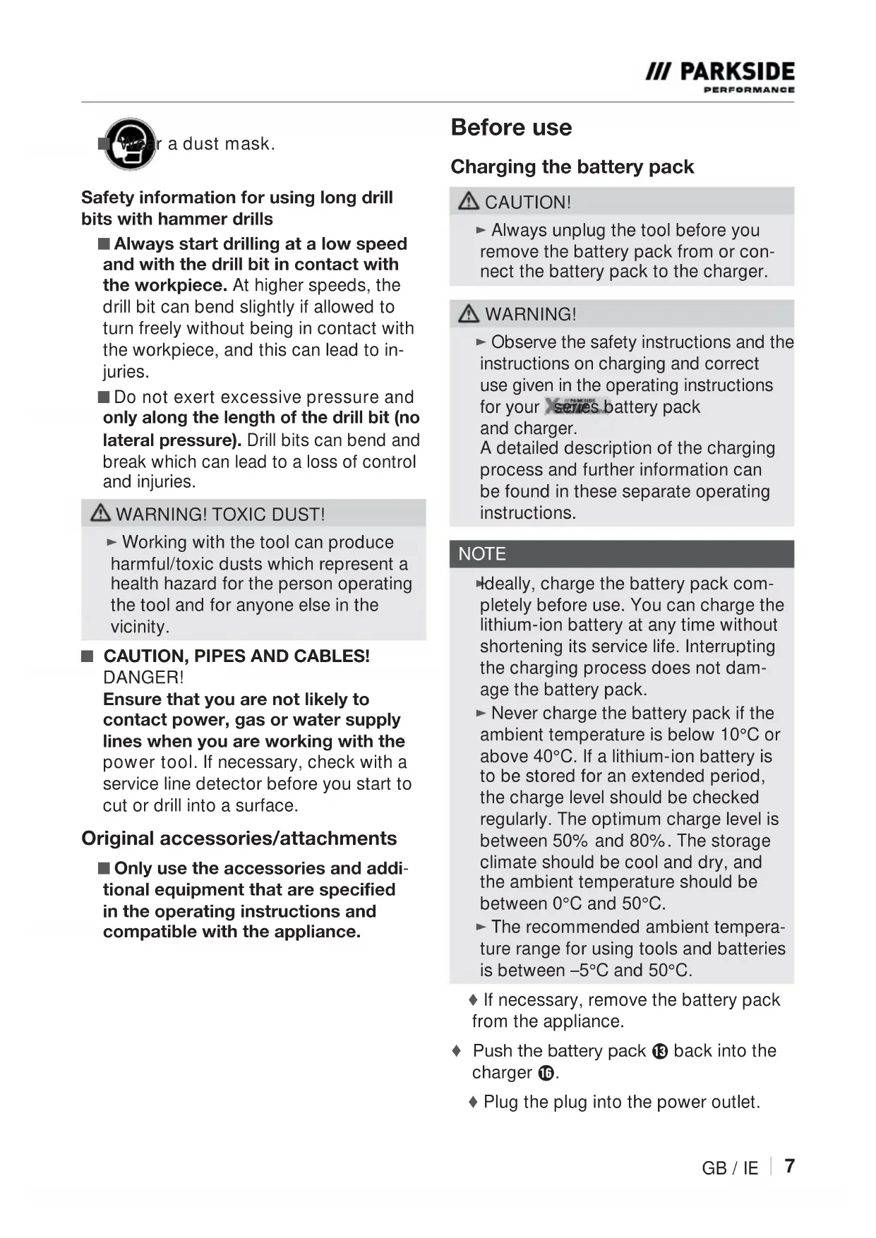 FRQWDFWSRZHUJDVRUZDWHUVXSSO\ OLQHVZKHQ\RXDUHZRUNLQJZLWKWKH power tool. If necessary, check with a service line detector before you start to cut or drill into a surface. 2ULJLQDODFFHVVRULHVDWWDFKPHQWV ■ 2QO\XVHWKHDFFHVVRULHVDQGDGGL- WLRQDOHTXLSPHQWWKDWDUHVSHFLƞHG LQWKHRSHUDWLQJLQVWUXFWLRQVDQG FRPSDWLEOHZLWKWKHDSSOLDQFH %HIRUHXVH &KDUJLQJWKHEDWWHU\SDFN CAUTION! ► Always unplug the tool before you remove the battery pack from or con- nect the battery pack to the charger. WARNING! ► Observe the safety instructions and the instructions on charging and correct use given in the operating instructions for your series battery pack and charger. A detailed description of the charging process and further information can be found in these separate operating instructions. NOTE