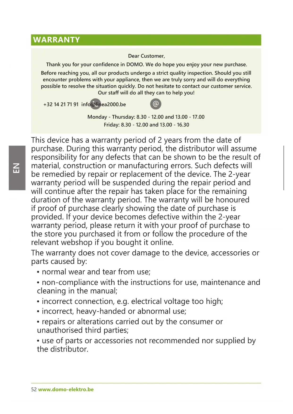 WARRANTY Dear Customer, Thank you for your condence in DOMO. We do hope you enjoy your new purchase. Before reaching you, all our products undergo a strict quality inspection. Should you still encounter problems with your appliance, then we are truly sorry and will do everything possible to resolve the situation quickly. Do not hesitate to contact our customer service. Our sta will do all they can to help you! +32 14 21 71 91 info@linea2000.be Monday - Thursday: 8.30 - 12.00 and 13.00 - 17.00 Friday: 8.30 - 12.00 and 13.00 - 16.30 This device has a warranty period of 2 years from the date of purchase. During this warranty period, the distributor will assume responsibility for any defects that can be shown to be the result of material, construction or manufacturing errors. Such defects will be remedied by repair or replacement of the device. The 2-year warranty period will be suspended during the repair period and will continue after the repair has taken place for the remaining duration of the warranty period. The warranty will be honoured if proof of purchase clearly showing the date of purchase is provided. If your device becomes defective within the 2-year warranty period, please return it with your proof of purchase to the store you purchased it from or follow the procedure of the relevant webshop if you bought it online. The warranty does not cover damage to the device, accessories or parts caused by: