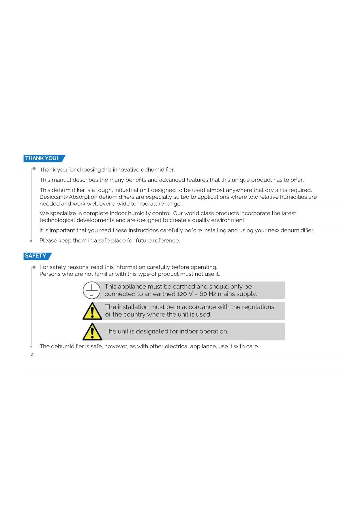 For safety reasons, read this information carefully before operating. Persons who are not familiar with this type of product must not use it. The dehumidier is safe, however, as with other electrical appliance, use it with care. The installation must be in accordance with the regulations of the country where the unit is used. The unit is designated for indoor operation. This appliance must be earthed and should only be connected to an earthed 120 V – 60 Hz mains supply.