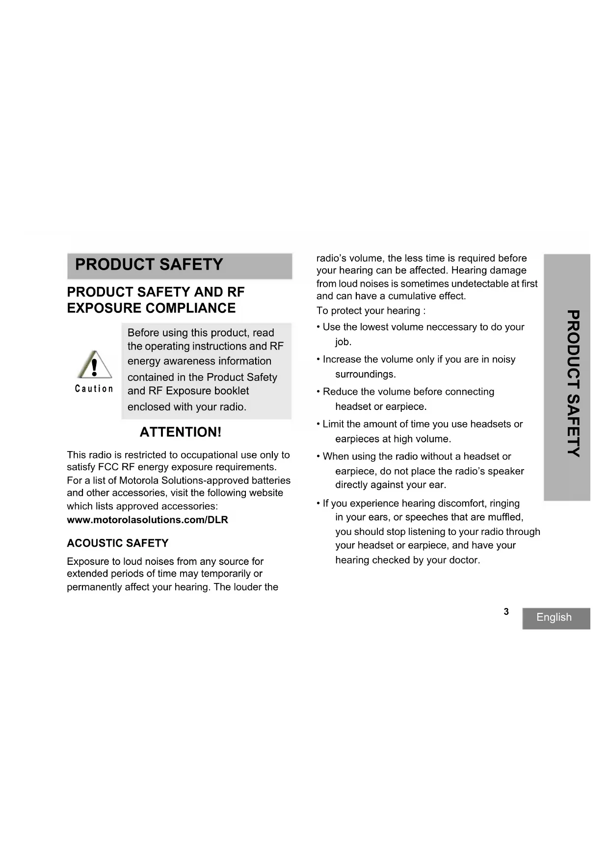 EXPOSURE COMPLIANCE ATTENTION! This radio is restricted to occupational use only to satisfy FCC RF energy exposure requirements. For a list of Motorola Solutions-approved batteries and other accessories, visit the following website which lists approved accessories: www.motorolasolutions.com/DLR ACOUSTIC SAFETY Exposure to loud noises from any source for extended periods of time may temporarily or permanently affect your hearing. The louder the radio’s volume, the less time is required before your hearing can be affected. Hearing damage from loud noises is sometimes undetectable at first and can have a cumulative effect. To protect your hearing :