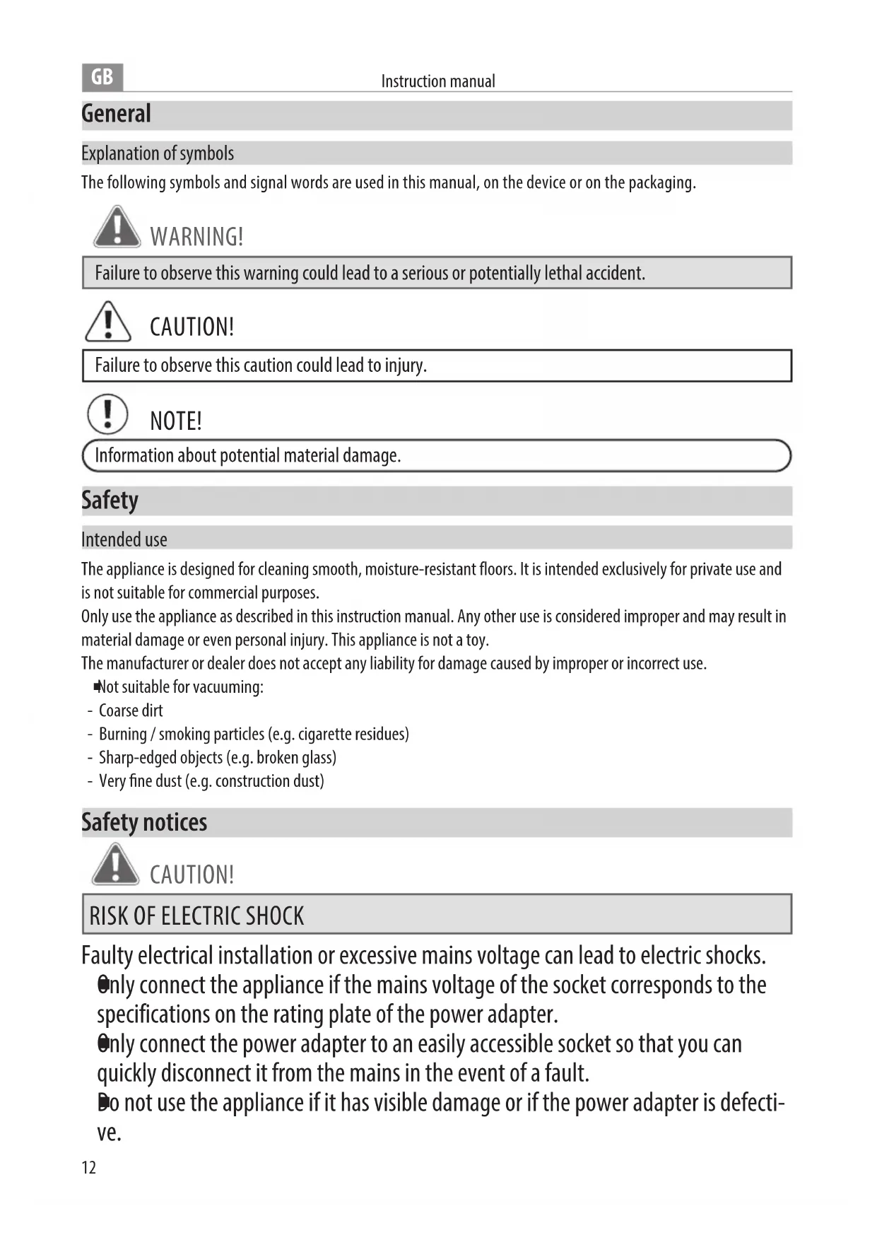 Instruction manual General Explanation of symbols The following symbols and signal words are used in this manual, on the device or on the packaging. Safety Intended use The appliance is designed for cleaning smooth, moisture-resistant floors. It is intended exclusively for private use and is not suitable for commercial purposes. Only use the appliance as described in this instruction manual. Any other use is considered improper and may result in material damage or even personal injury. This appliance is not a toy. The manufacturer or dealer does not accept any liability for damage caused by improper or incorrect use. Not suitable for vacuuming: - Coarse dirt - Burning / smoking particles (e.g. cigarette residues) - Sharp-edged objects (e.g. broken glass) - Very ne dust (e.g. construction dust) Safety notices CAUTION!