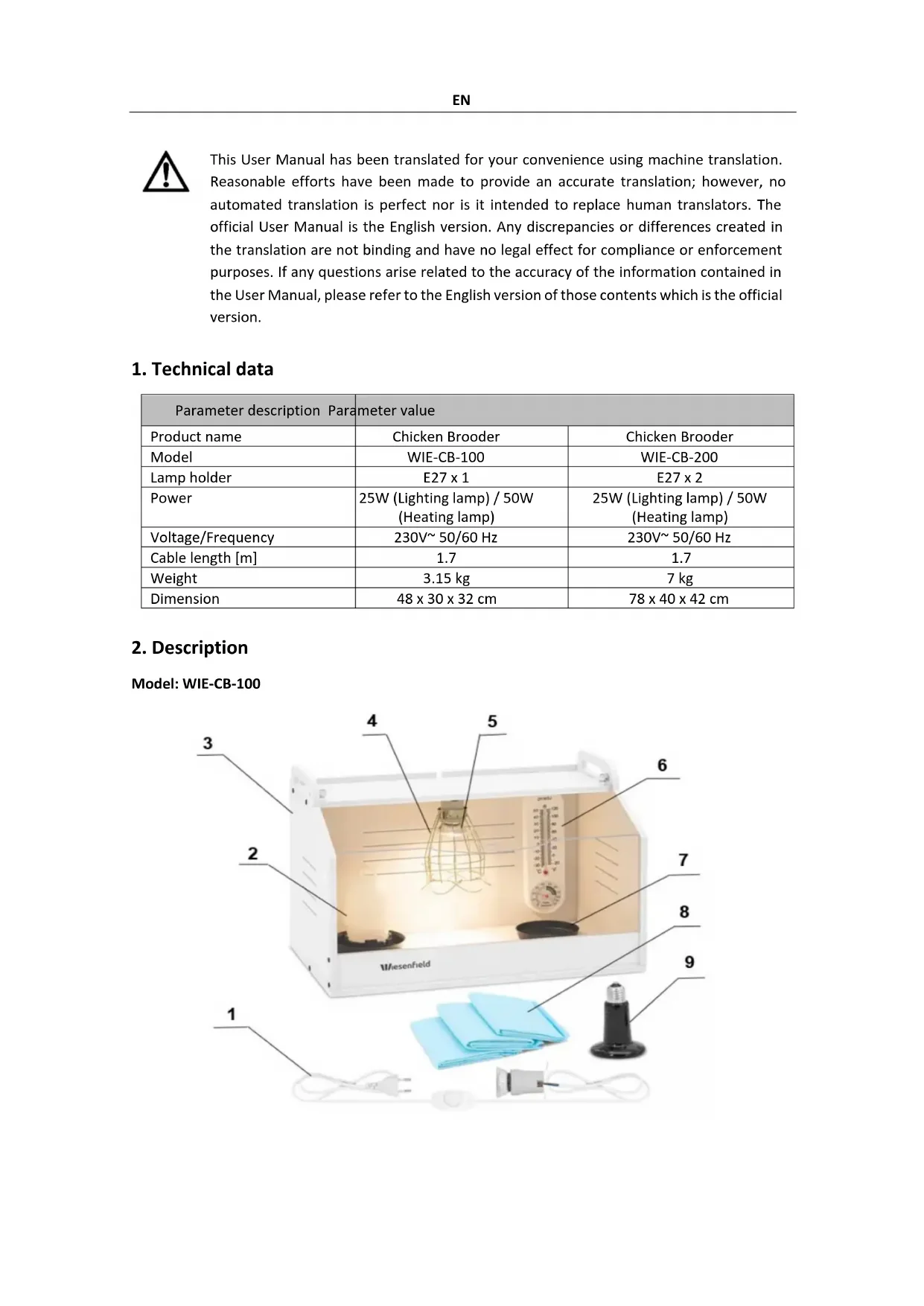 Model: WIE-CB-100EN 1 – Power cable 2 – Ball type poultry drinker 3 – Housing 4 – Anti-scald cover 5 – Lamp with dimmer 6 – Thermometer 7 – Feeding bowl 8 – Floor mats 9 – Heating lamp with dimmer Model: WIE-CB-200 1 – Flo or mats 2 – Ball type poultry drinker 3 – Housing 4 – Anti-scald cover 5 – Heating lamp with dimmer 6 – Thermometer 7 – Lamp with dimmer 8 – Feeding bowlEN