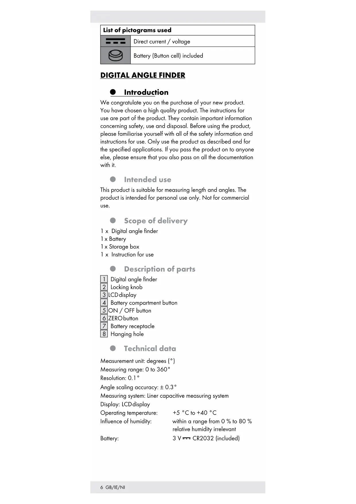 Hanging hole Technical data Measurement unit: degrees (°) Measuring range: 0 to 360° Resolution: 0.1° Angle scaling accuracy: ± 0.3° Measuring system: Liner capacitive measuring system Display: LCD display Operating temperature: +5 °C to +40 °C Influence of humidity: within a range from 0 % to 80 % relative humidity irrelevant Battery: 3 V CR2032 (included)7 GB/IE/NI Safety instructions