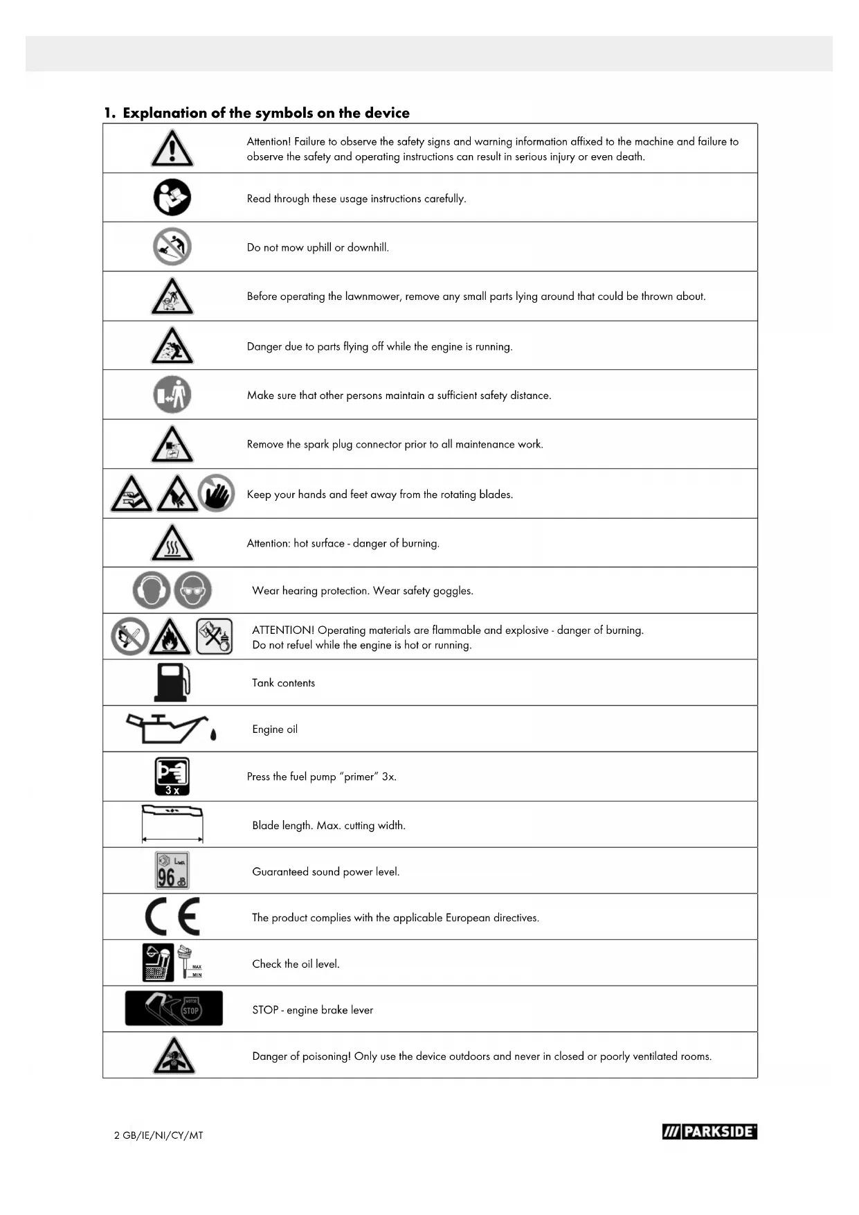 Press the fuel pump “primer” 3x. Blade length. Max. cutting width. Guaranteed sound power level. The product complies with the applicable European directives. MIN MAX Check the oil level. STOP MOTOR STOP - engine brake lever Danger of poisoning! Only use the device outdoors and never in closed or poorly ventilated rooms.3GB/IE/NI/CY/MT m Attention! We have marked points in these operating instructions that impact your safety with this symbol. DANGER! Signal word to indicate an imminently hazardous situation which, if not avoided, will result in death or seri- ous injury. WARNING! Signal word to indicate a potentially hazardous situation which, if not avoided, could result in death or serious injury. CAUTION! Signal word to indicate a potentially hazardous situation which, if not avoided, could result in minor or moderate injury. NOTE Signal word to indicate a potentially hazardous situation which, if not avoided, could result in product or property damage.4 GB/IE/NI/CY/MT