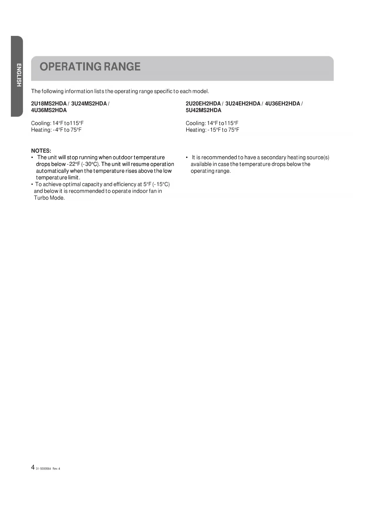 - It is recommended to have a secondary heating source(s) available in case the temperature drops below the operating range. The following information lists the operating range specific to each model.31-5000564 Rev. 4 5 ENGLISH