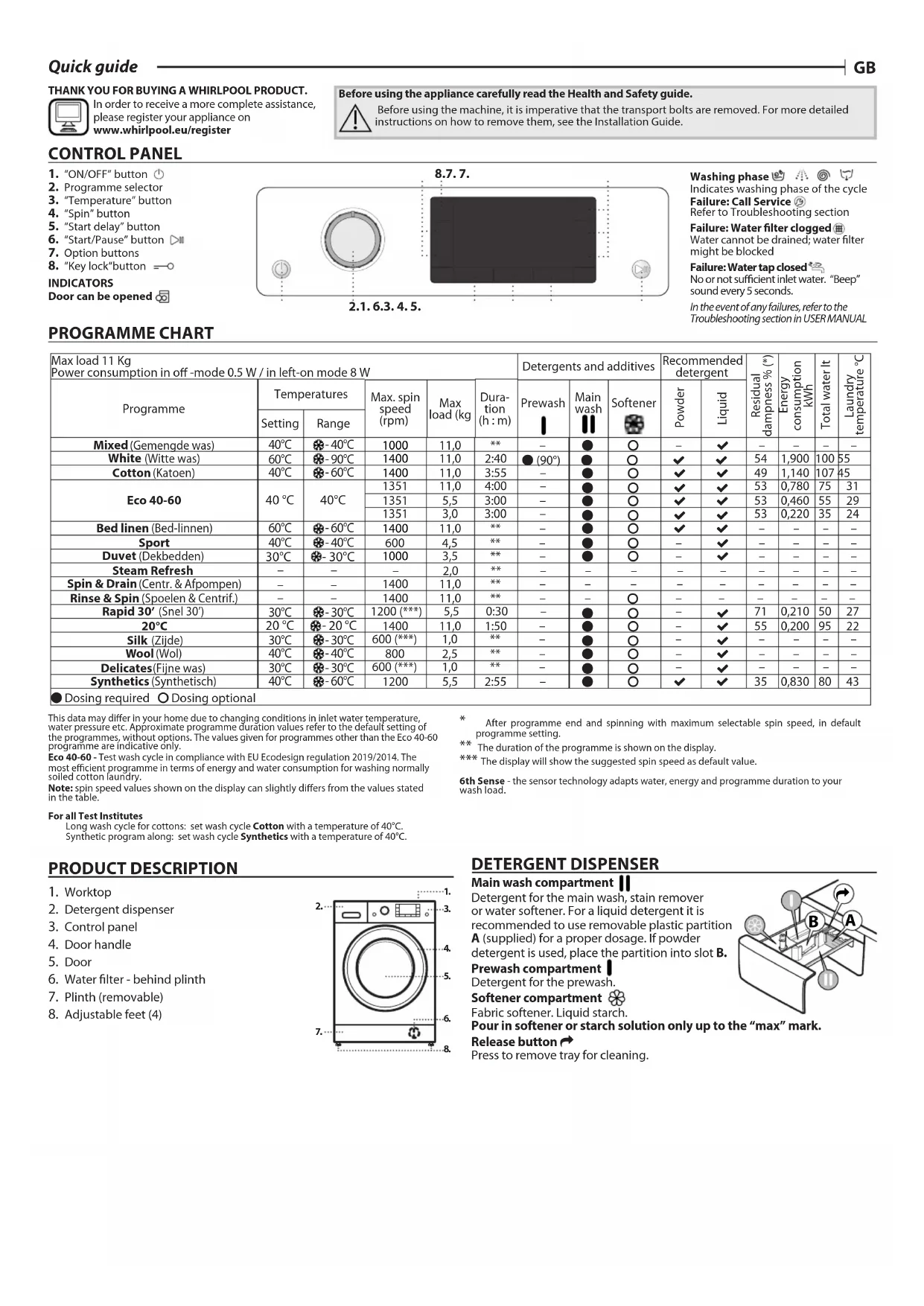 After programme end and spinning with maximum selectable spin speed, in default programme setting. The duration of the programme is shown on the display. *** The display will show the suggested spin speed as default value. 6th Sense - the sensor technology adapts water, energy and programme duration to your wash load.This data may dier in your home due to changing conditions in inlet water temperature, water pressure etc. Approximate programme duration values refer to the default setting of the programmes, without options. The values given for programmes other than the Eco 40-60 programme are indicative only.Eco 40-60 - Test wash cycle in compliance with EU Ecodesign regulation 2019/2014. The most ecient programme in terms of energy and water consumption for washing normally soiled cotton laundry.Note: spin speed values shown on the display can slightly diers from the values stated in the table.For all Test Institutes Long wash cycle for cottons: set wash cycle Cotton with a temperature of 40°C. Synthetic program along: set wash cycle Synthetics with a temperature of 40°C. Max load 11 KgPower consumption in o -mode 0.5 W / in left-on mode 8 WDetergents and additivesRecommended detergentResidual dampness % (*)Energy consumption kWh Total water ltLaundry temperature °CProgrammeTemperaturesMax. spin speed (rpm) Max load (kgDura-tion (h : m)PrewashMain wash SoftenerPowderLiquidSetting RangeMixed (Gemengde was) 40°C - 40°C 1000 11,0 ** –