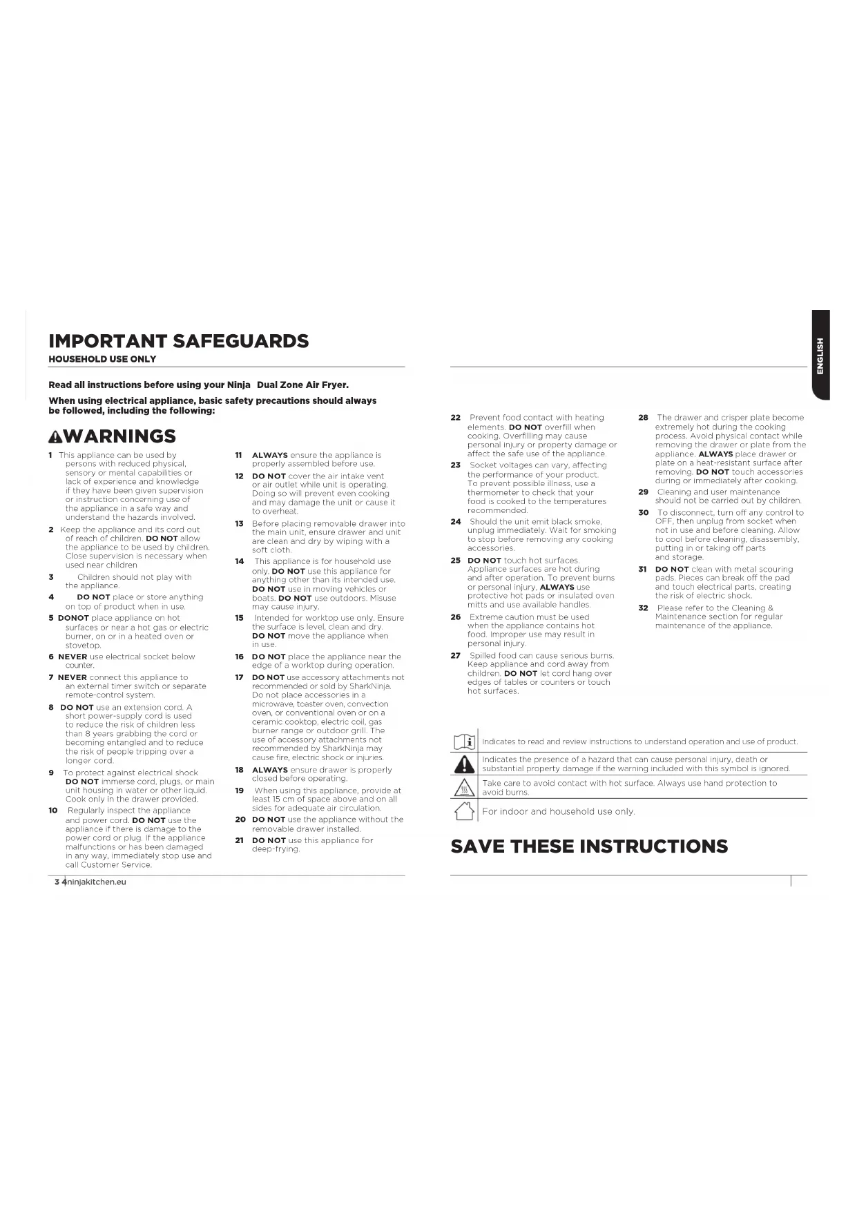 Indicates to read and review instructions to understand operation and use of product. Indicates the presence of a hazard that can cause personal injury, death or substantial property damage if the warning included with this symbol is ignored. Take care to avoid contact with hot surface. Always use hand protection to avoidburns. For indoor and household use only. ENGLISH6ninjakitchen.eu MAX CRISP AIR FRY ROAST REHEAT DEHYDRATE BAKESYNC MATCHSTART STOP