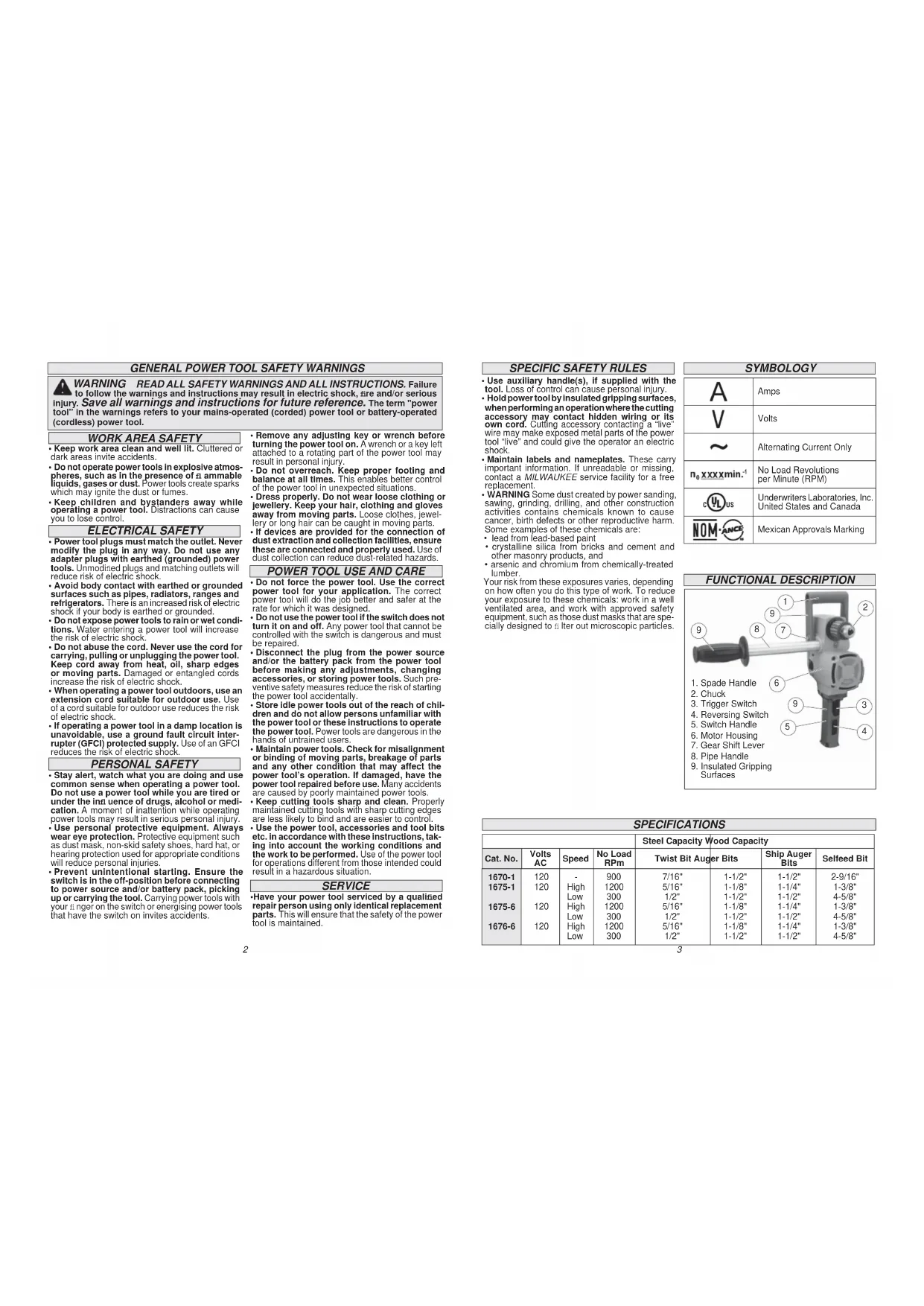 LIMITED WARRANTY - MEXICO, CENTRAL AMERICA AND CARIBBEAN Model: Date of Purchase: Distributor or Store Stamp: Every MILWAUKEE power tool (including cordless product – tool, battery pack(s) - see separate & distinct CORDLESS BATTERY PACK LIMITED WARRANTY statements & battery charger and Work Lights*) is war- ranted to the original purchaser only to be free from defects in material and workmanship. Subject to certain exceptions, MILWAUKEE will repair or replace any part on an electric power tool which, after examination, is determined by MILWAUKEE to be defective in material or workmanship for a period of fi ve (5) years* after the date of purchase unless otherwise noted. Return of the power tool to a MILWAUKEE factory Service Center location or MILWAUKEE Authorized Service Station, freight prepaid and insured, is required. A copy of the proof of purchase should be included with the return product. This warranty does not apply to damage that MILWAUKEE determines to be from repairs made or attempted by anyone other than MILWAUKEE authorized personnel, misuse, alterations, abuse, normal wear and tear, lack of maintenance, or accidents. *The warranty period for, Job Site Radios, M12™ Power Port, M18™ Power Source, and Trade Titan™ Indus- trial Work Carts is one (1) year from the date of purchase. The warranty period for a LED Work Light and LED Upgrade Bulb is a limited LIFETIME warranty to the original purchaser only, if during normal use the LED bulb fails the Work Light or Upgrade Bulb will be replaced free of charge. *This warranty does not cover Air Nailers & Stapler, Airless Paint Sprayer, Cordless Battery Packs, Gasoline Driven Portable Power Generators, Hand Tools, Hoist – Electric, Lever & Hand Chain, M12™ Heated Jackets, Reconditioned product and Test & Measurement products. There are separate and distinct warranties avail- able for these products. Warranty Registration is not necessary to obtain the applicable warranty on a MILWAUKEE power tool product. The manufacturing date of the product will be used to determine the warranty period if no proof of purchase is provided at the time warranty service is requested. ACCEPTANCE OF THE EXCLUSIVE REPAIR AND REPLACEMENT REMEDIES DESCRIBED HEREIN IS A CONDITION OF THE CONTRACT FOR THE PURCHASE OF EVERY MILWAUKEE PRODUCT. IF YOU DO NOT AGREE TO THIS CONDITION, YOU SHOULD NOT PURCHASE THE PRODUCT. IN NO EVENT SHALL MIL- WAUKEE BE LIABLE FOR ANY INCIDENTAL, SPECIAL, CONSEQUENTIAL OR PUNITIVE DAMAGES, OR FOR ANY COSTS, ATTORNEY FEES, EXPENSES, LOSSES OR DELAYS ALLEGED TO BE AS A CONSEQUENCE OF ANY DAMAGE TO, FAILURE OF, OR DEFECT IN ANY PRODUCT INCLUDING, BUT NOT LIMITED TO, ANY CLAIMS FOR LOSS OF PROFITS. SOME STATES DO NOT ALLOW THE EXCLUSION OR LIMITATION OF IN- CIDENTAL OR CONSEQUENTIAL DAMAGES, SO THE ABOVE LIMITATION OR EXCLUSION MAY NOT APPLY TO YOU. THIS WARRANTY IS EXCLUSIVE AND IN LIEU OF ALL OTHER EXPRESS WARRANTIES, WRITTEN OR ORAL. TO THE EXTENT PERMITTED BY LAW, MILWAUKEE DISCLAIMS ANY IMPLIED WARRANTIES, INCLUDING WITHOUT LIMITATION ANY IMPLIED WARRANTY OF MERCHANTABILITY OR FITNESS FOR A PARTICULAR USE OR PURPOSE; TO THE EXTENT SUCH DISCLAIMER IS NOT PERMITTED BY LAW, SUCH IMPLIED WARRANTIES ARE LIMITED TO THE DURATION OF THE APPLICABLE EXPRESS WARRANTY AS DESCRIBED ABOVE. SOME STATES DO NOT ALLOW LIMITATIONS ON HOW LONG AN IMPLIED WARRANTY LASTS, SO THE ABOVE LIMITATION MAY NOT APPLY TO YOU, THIS WARRANTY GIVES YOU SPECIFIC LEGAL RIGHTS, AND YOU MAY ALSO HAVE OTHER RIGHTS WHICH VARY FROM STATE TO STATE. This warranty applies to product sold in the U.S.A. and Canada only. Please consult the ‘Service Center Search’ in the Parts & Service section of MILWAUKEE’s website www.mil- waukeetool.com or call 1.800.SAWDUST (1.800.729.3878) to locate your nearest service facility for warranty and non-warranty service on a Milwaukee electric power tool. RÈGLES DE SÉCURITÉ GÉNÉRALES RELATIVES AUX OUTILS ÉLECTRIQUES AVERTISSEMENT LIRE TOUTES LES RÈGLES ET INSTRUCTIONS DE SÉCURITÉ. Ne pas suivre l’ensemble des règles et instructions peut entraîner une électrocution, un incendie ou des blessures graves. Conserver les règles et les instructions à des fi ns de référence ultérieure. Le terme «outil électrique» fi gurant dans les avertissements ci- dessous renvoie à l’outil électrique à alimentation par le réseau (à cordon) ou par batterie (sans fi l).