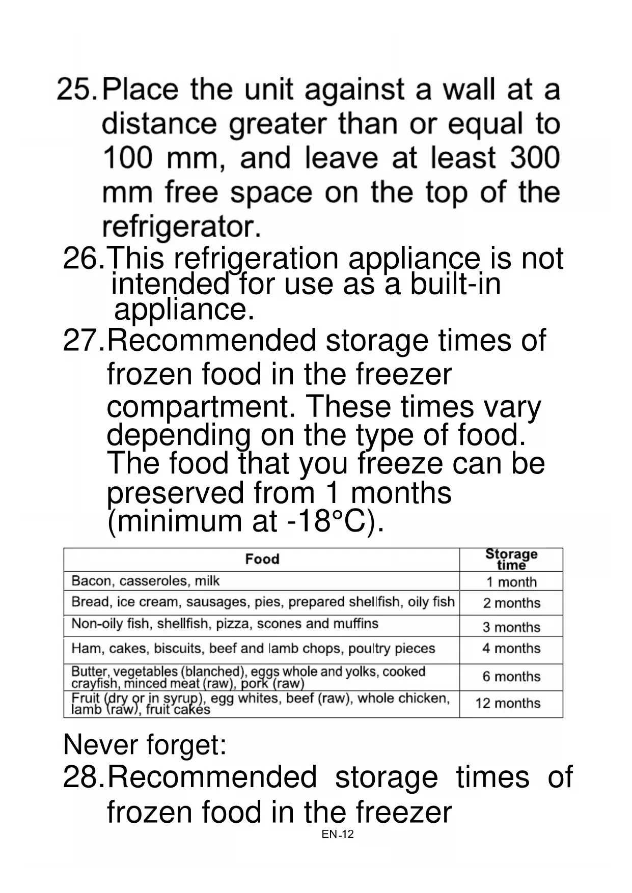 ntended for use as a built-in appliance. 27.Recommended storage times of frozen food in the freezer compartment. These times vary depending on the type of food. The food that you freeze can be preserved from 1 months (minimum at -18°C). Never forget:
