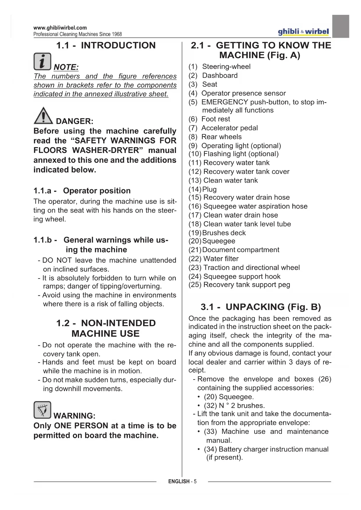 - BATBAT MATMAT PEPE MASMAS EB1 49029600_Manuale RACER_RANGER_8ed_04-2023.indd 2649029600_Manuale RACER_RANGER_8ed_04-2023.indd 26 06/04/2023 15:00:3706/04/2023 15:00:37www.ghibliwirbel.com Professional Cleaning Machines Since 1968 ENGLISH - 1 Dear Customer, Thank you for choosing one of our cleaning products. The floor scrubber dryer that you have purchased has been designed to satisfy the user in terms of ease of use and reliability over time. We are aware that in order for a good product to stay that way, over time, it requires continuous updates aimed at meeting the expectations of those who use it on a daily basis. For this reason, we hope that you will not only be a satisfied customer but also a partner who does not hesitate to give us your opinions and ideas originating from your personal day-to-day experience. 49029600_Manuale RACER_RANGER_8ed_04-2023.indd 149029600_Manuale RACER_RANGER_8ed_04-2023.indd 1 06/04/2023 15:01:3506/04/2023 15:01:35www.ghibliwirbel.com Professional Cleaning Machines Since 1968 ENGLISH - 2 INDEX INDEX p. 2