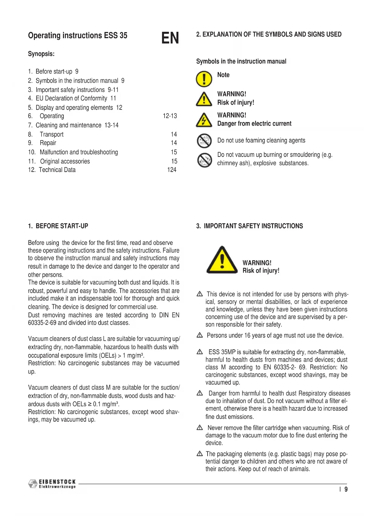 Download the instructions for your Vacuum Cleaner in PDF format for free! Find your manual ESS 35MP - Eibenstock and take your electronic device back in hand. On this page are published all the documents necessary for the use of your device. ESS 35MP by Eibenstock.