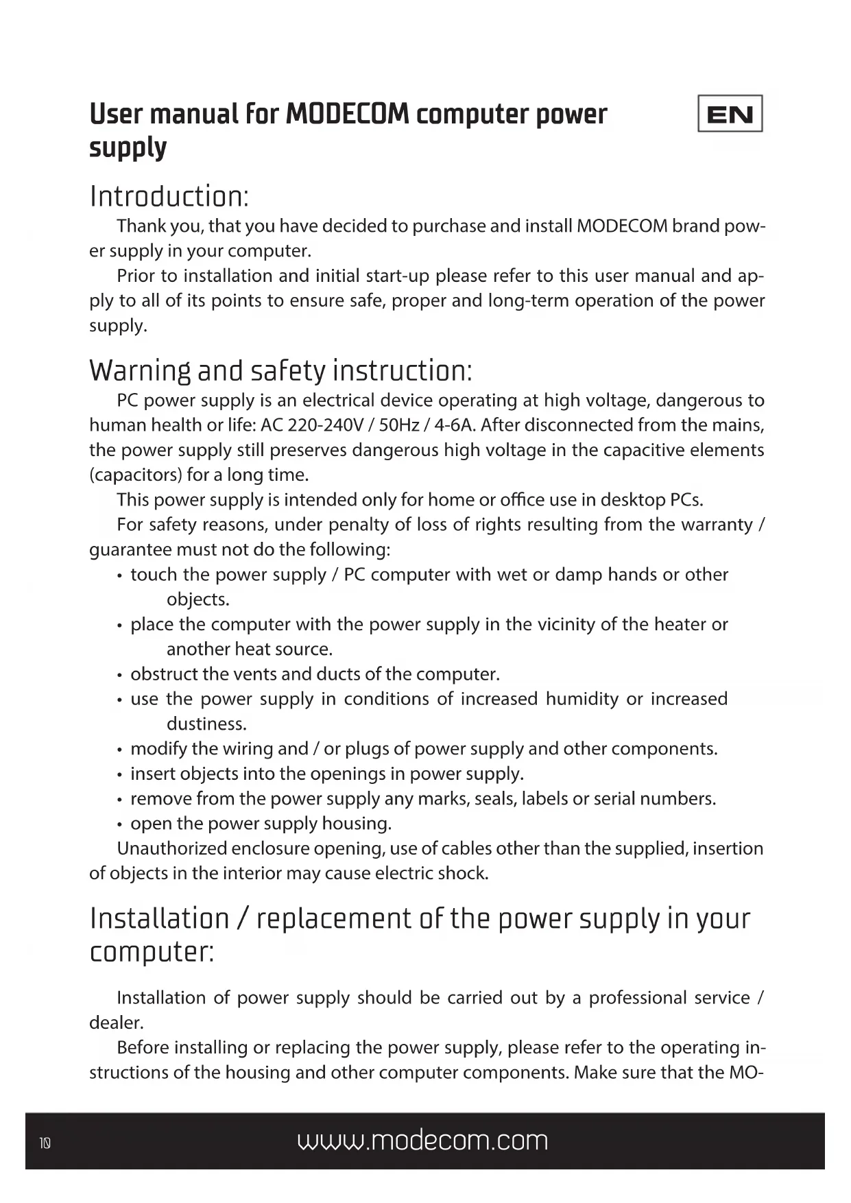 User manual for MODECOM computer power supply Introduction: Thank you, that you have decided to purchase and install MODECOM brand pow- er supply in your computer. Prior to installation and initial start-up please refer to this user manual and ap- ply to all of its points to ensure safe, proper and long-term operation of the power supply. Warning and safety instruction: PC power supply is an electrical device operating at high voltage, dangerous to human health or life: AC 220-240V / 50Hz / 4-6A. After disconnected from the mains, the power supply still preserves dangerous high voltage in the capacitive elements (capacitors) for a long time. This power supply is intended only for home or oce use in desktop PCs. For safety reasons, under penalty of loss of rights resulting from the warranty / guarantee must not do the following: