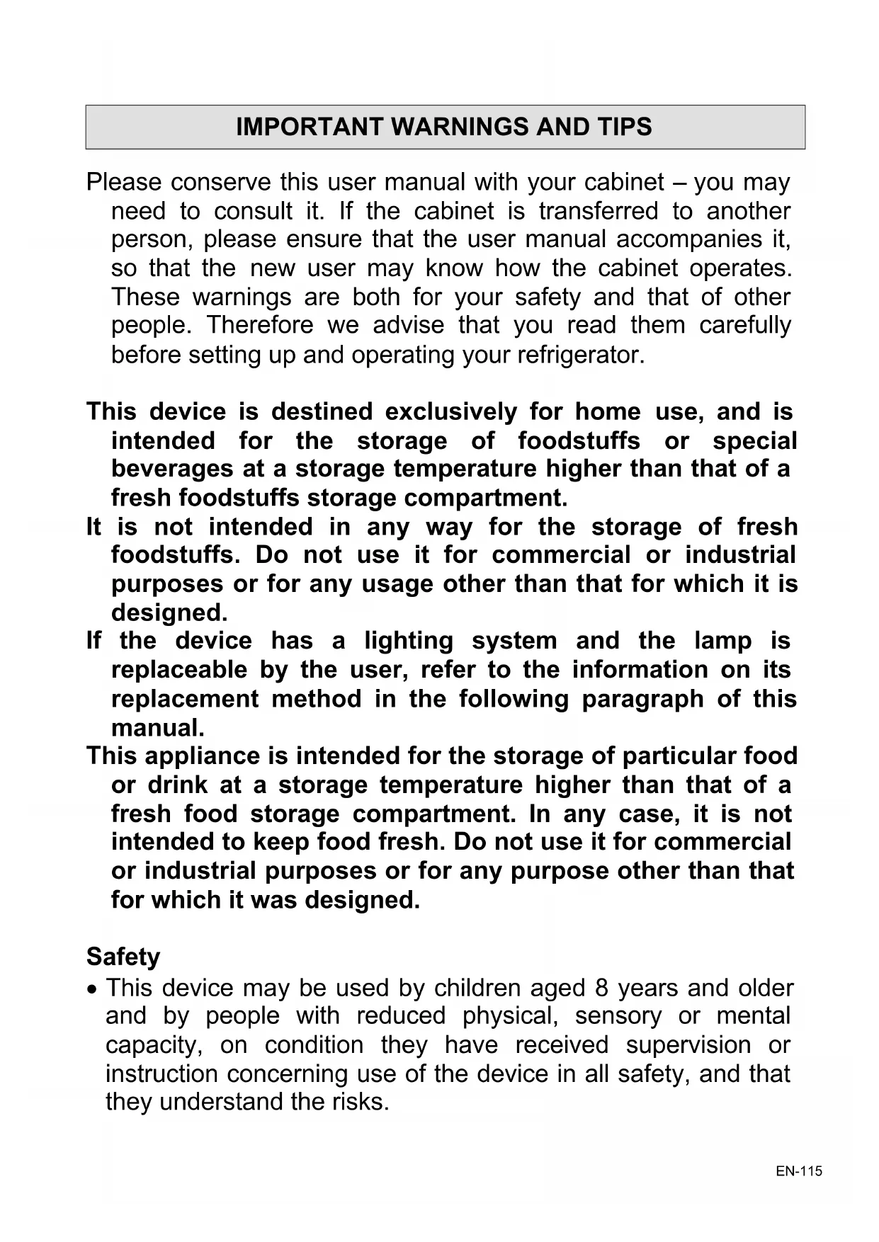 Please conserve this user manual with your cabinet – you may need to consult it. If the cabinet is transferred to another person, please ensure that the user manual accompanies it, so that the new user may know how the cabinet operates. These warnings are both for your safety and that of other people. Therefore we advise that you read them carefully before setting up and operating your refrigerator. This device is destined exclusively for home use, and is intended for the storage of foodstuffs or special beverages at a storage temperature higher than that of a fresh foodstuffs storage compartment. It is not intended in any way for the storage of fresh foodstuffs. Do not use it for commercial or industrial purposes or for any usage other than that for which it is designed. If the device has a lighting system and the lamp is replaceable by the user, refer to the information on its replacement method in the following paragraph of this manual. This appliance is intended for the storage of particular food or drink at a storage temperature higher than that of a fresh food storage compartment. In any case, it is not intended to keep food fresh. Do not use it for commercial or industrial purposes or for any purpose other than that for which it was designed. Safety