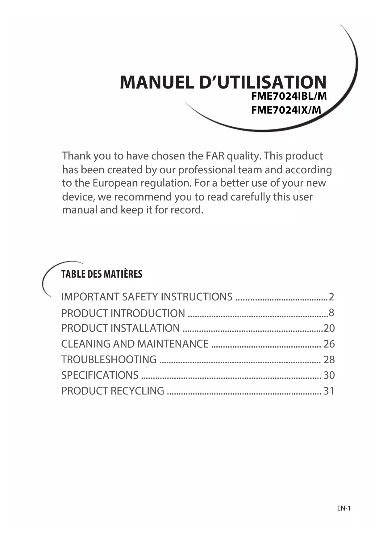 Thank you to have chosen the FAR quality. This product has been created by our professional team and according to the European regulation. For a better use of your new device, we recommend you to read carefully this user manual and keep it for record.