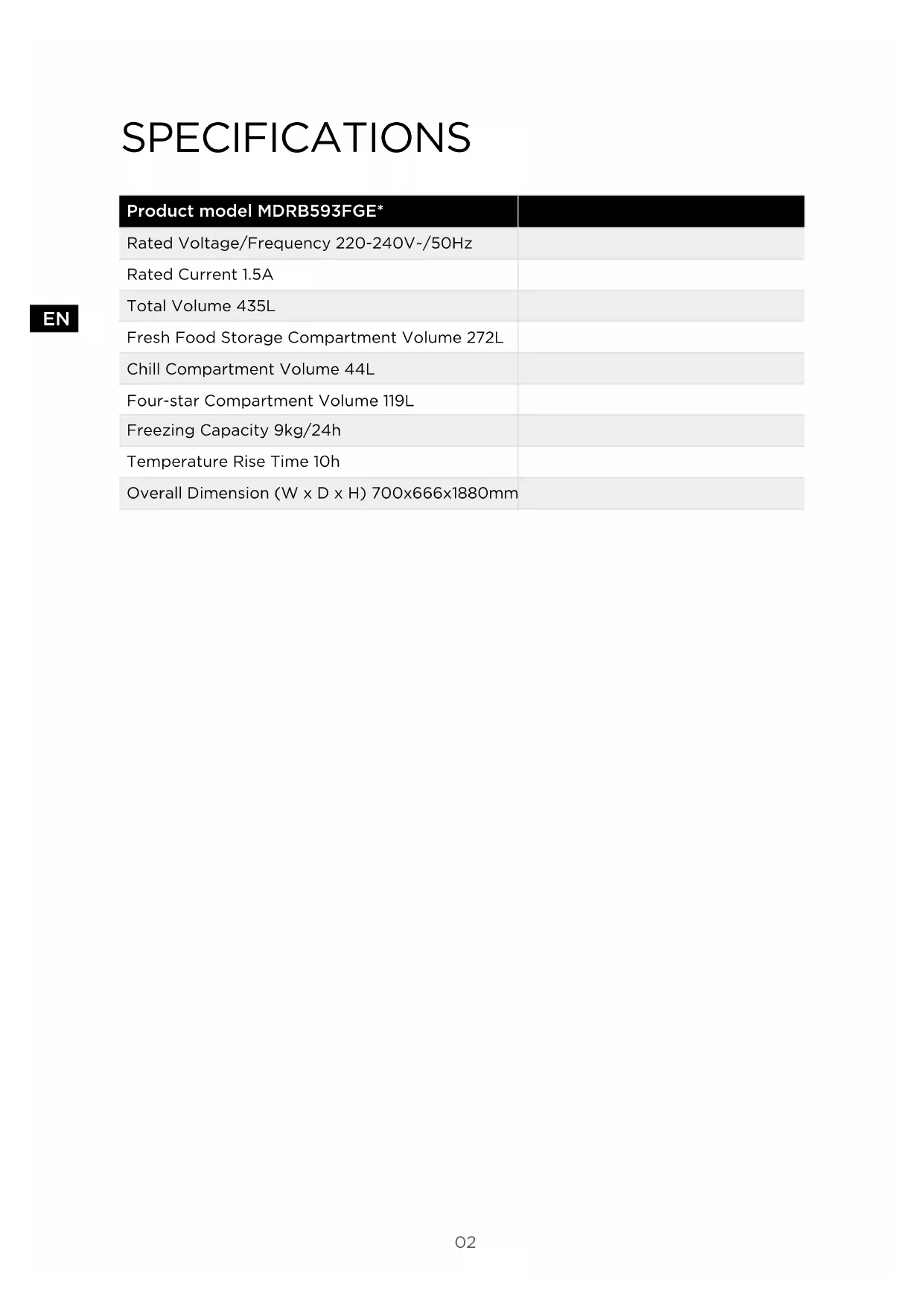 SPECIFICATIONS Product model MDRB593FGE* Rated Voltage/Frequency 220-240V~/50Hz Rated Current 1.5A Total Volume 435L Fresh Food Storage Compartment Volume 272L Chill Compartment Volume 44L Four-star Compartment Volume 119L Freezing Capacity 9kg/24h Temperature Rise Time 10h Overall Dimension (W x D x H) 700x666x1880mm03