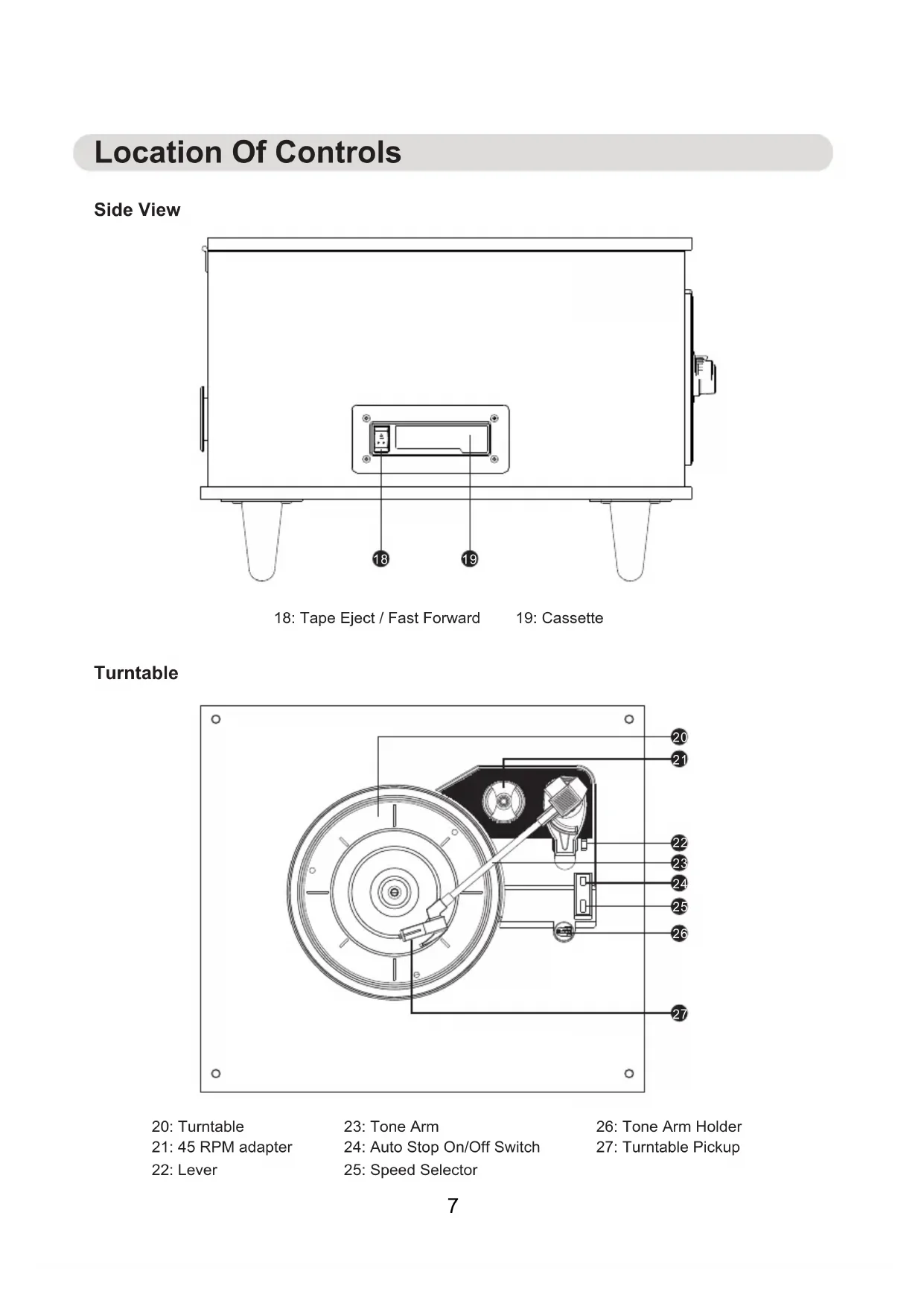 Side View Turntable 23: Tone Arm 24: Auto Stop On/Off Switch 25: Speed Selector 26: Tone Arm Holder 27: Turntable Pickup 20: Turntable 21: 45 RPM adapter 22: Lever 18: Tape Eject / Fast Forward 19: Cassette 7Assembly Carefully turn the Nostalgia Bluetooth 7 in 1 music system over so that lid is resting on the floor,place it onto a soft surface to protect it from scratches. Screw the four legs onto the underside of the 7 in 1 music system. Stand the Nostalgia Bluetooth 7 in 1 music system on a flat ,stable surface Using music system Basic Functionality Plug the DC input jack on the power adaptor into the DC input socket on the reverse of the music system and then plug the adaptor into the mains power supply and switch it on . Turn on the music system by rotating the on/off/volume control dial in a clockwise direction,until it clicks . Short Press “MODE/REC “ button until your desired operation is selected (Bluetooth,CD,Turntable, FM,AM,Aux,USB,TAPE ). Long press “MODE/REC “ button to USB encoding (Only encoding during turntable mode) . Rotate the AM/FM Radio control dial in a clockwise direction to your desired radio mode Adjust volume by rotating the on/off/volume control dial . Rotate in a clock direction to increase the volume and Rotate in an anticlockwise direction to decrease the volume. To pause the track,press PLAY/PAUSE button, push it again to resume the track. Switch to next track by pressing “Next” button; play previous track by pressing “PREV” button. To open the Disc tray by pressing “OPEN/CLOSE” button, press “OPEN/CLOSE” button again to close Disc tray. To Stop CD play by pressing “Stop” button. To turn off the music system,rotate the on/off/volume control dial in an anticlockwise direction,until it clicks. Listening to a Record STEP 1: Turn on the music system by rotating the ‘On/Off/ Volume Dial’ in a clockwise direction . STEP 2: Short press the “MODE/REC “ button to turntable mode . STEP 3: Remove the protective white needle cover by gently sliding it away from the tone arm. STEP 4: Carefully place a record onto the turntable,remembering to apply the 45 rpm adapter first, if listening to a 45 rpm record with a large centre hole. STEP 5: Unlock the tone arm from the arm lock by pushing it aside. STEP 6: Raise the tone arm using the arm raising lever or by carefully lifting it . STEP 7: Move the tone arm across to the outlet edge of the record and gently lower it , the turntable will begin to spin and play automatically. STEP 8: Once the tone arm reaches the end of the record at the centre of the turntable,the turntable will stop.Lift away the tone arm and place it back into the armrest. STEP 9: Secure the tone arm once more by engaging the arm lock. STEP 10: Rotate the “On/Off/ Volume Dial” in an anticlockwise direction unit it clicks ,to turn off Turntable . Note: Always ensure that the tone arm is secured before transporting . Instructions For Use 8Replacing The Stylus The music system stylus should last approximately 400~450 hrs under normal use .However, it is recommended that the stylus be replaced as soon as a change in sound quality is noticed. Prolonged use of a wore-out stylus may damage any records and the highest speed 78rpm records will wear out the stylus more quickly. Removing the old stylus STEP 1: Carefully place a screwdriver at the tip of the stylus and push downward (A) . STEP 2: Remove the old stylus by gently pulling it down and forward simultaneously . Installing a New Stylus STEP 1: Hold the stylus at front edge(needle side) and insert the rear edge onto the tone arm(B). STEP 2: Push the stylus upward ,until it locks into position©. Caution: The music system must be powered off using the on/off /volume control dial before replacing the stylus. Do not bend the stylus or touch the needle,as the may cause injury. Playing with CD Inserting a CD STEP 1: To access the built-in CD player, eject the disc tray by pressing “OPEN/CLOSE” button. STEP 2: Insert the CD to be played with artwork visible.Gently press the CD into the disk tray and then close the CD player STEP 3: Short press the “MODE/REC “ button to CD mode