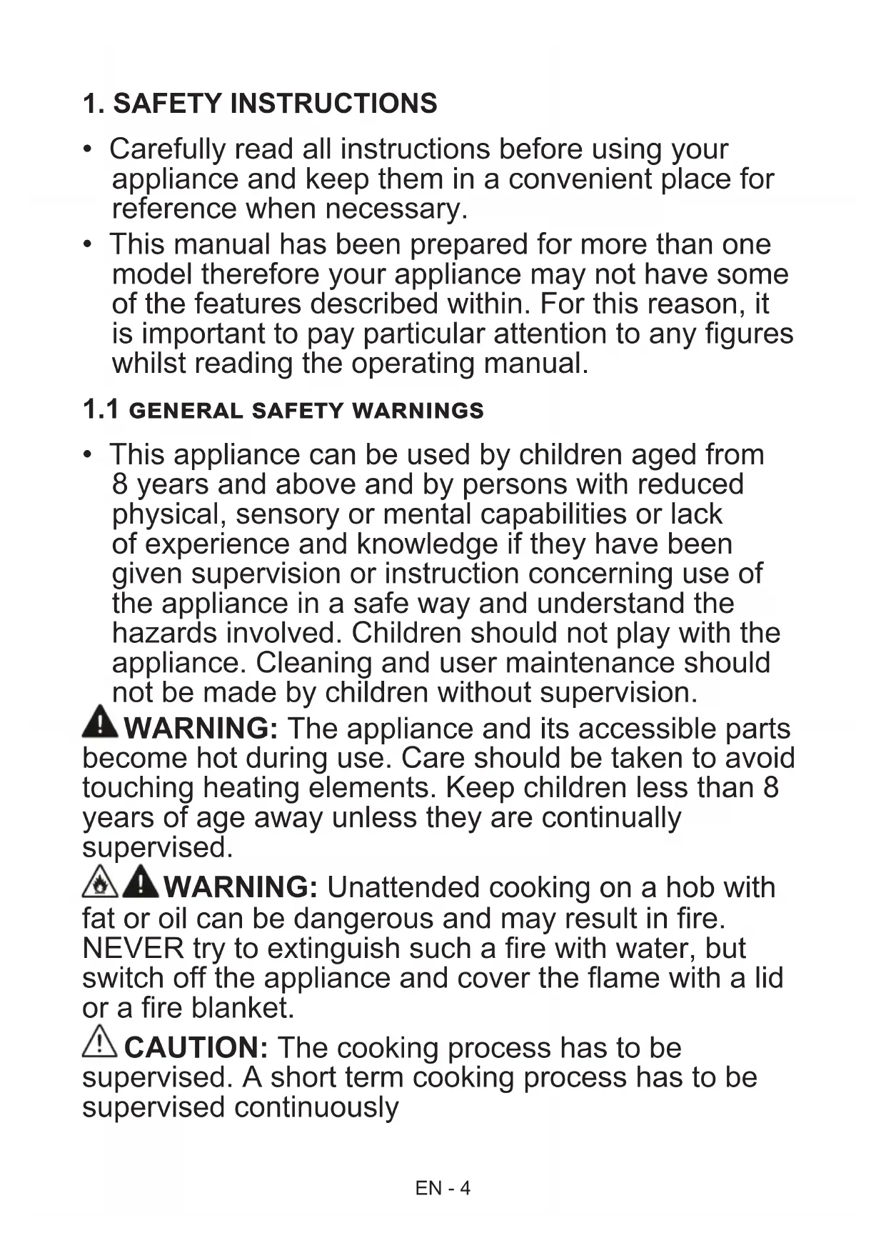 fat or oil can be dangerous and may result in fire. NEVER try to extinguish such a fire with water, but switch off the appliance and cover the flame with a lid or a fire blanket. CAUTION: The cooking process has to be supervised. A short term cooking process has to be supervised continuouslyEN - 5